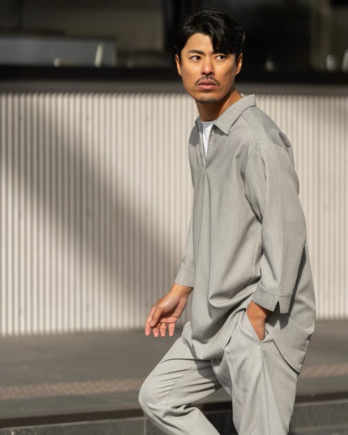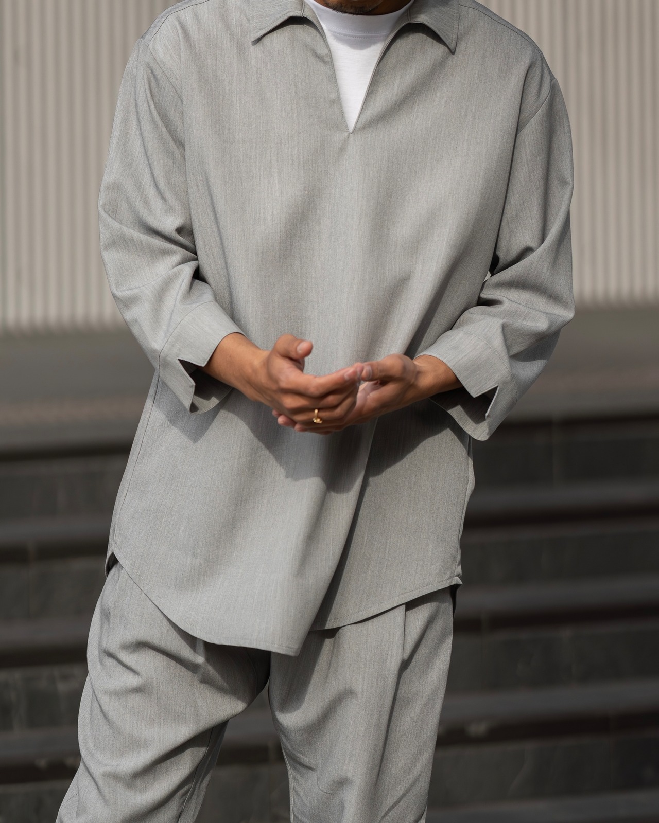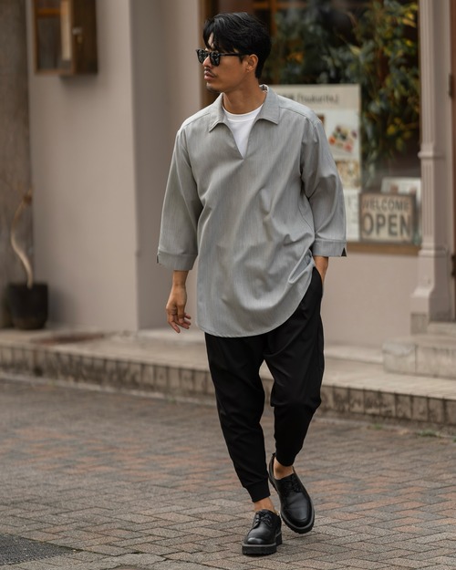 シャープな胸元を演出するスキッパーデザインのプルオーバー七分袖シャツ