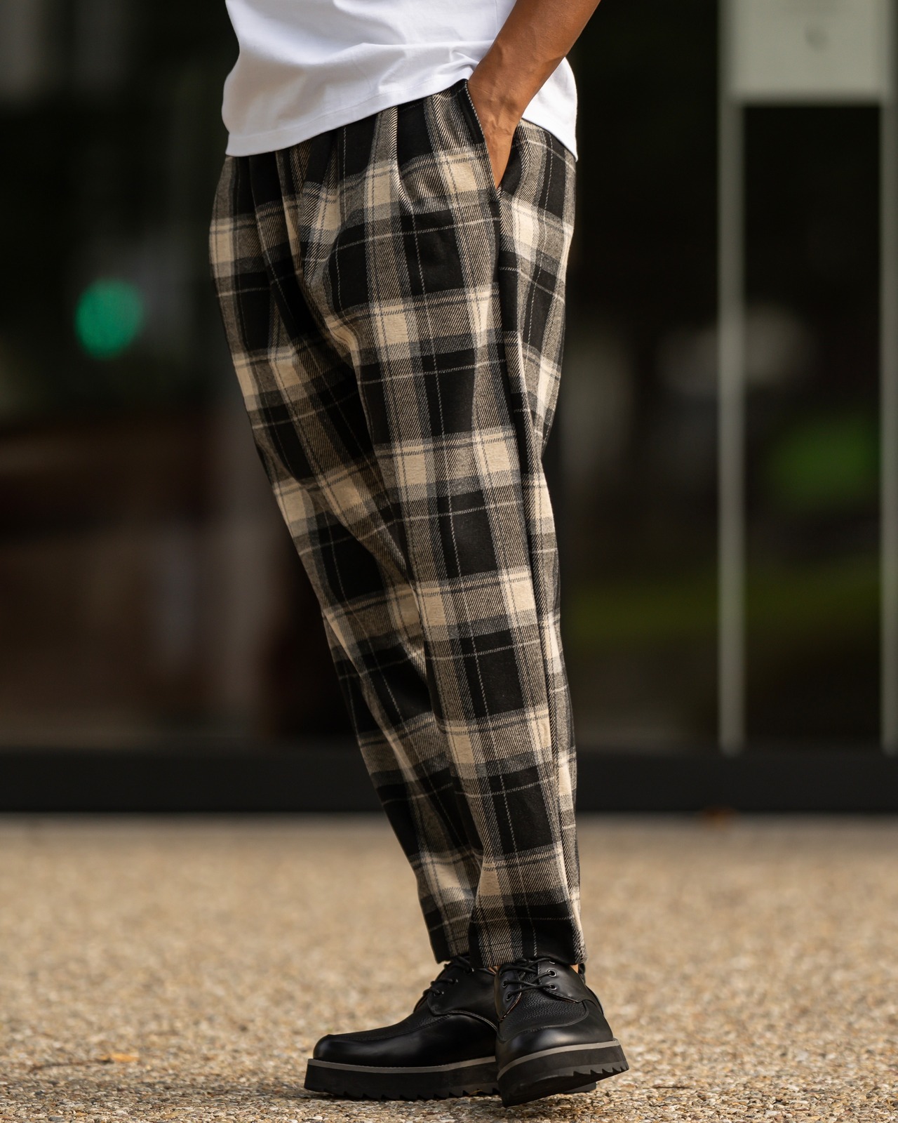 マドラスチェック柄のスムースカットソーを使用したリラックステーパードパンツ