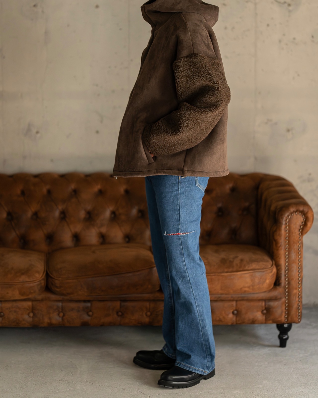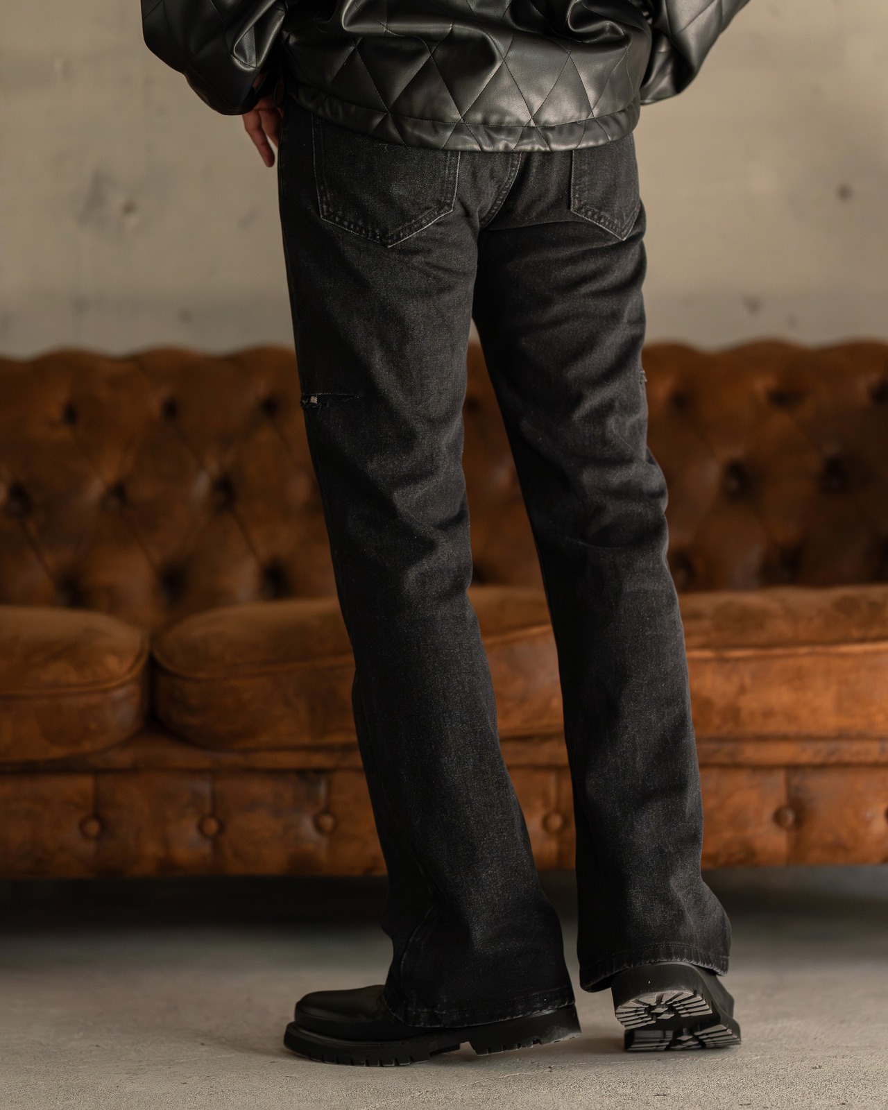 丹念なウォッシュ加工とチェック柄リペアが映える、セミフレアシルエットのジーンズ。