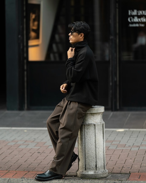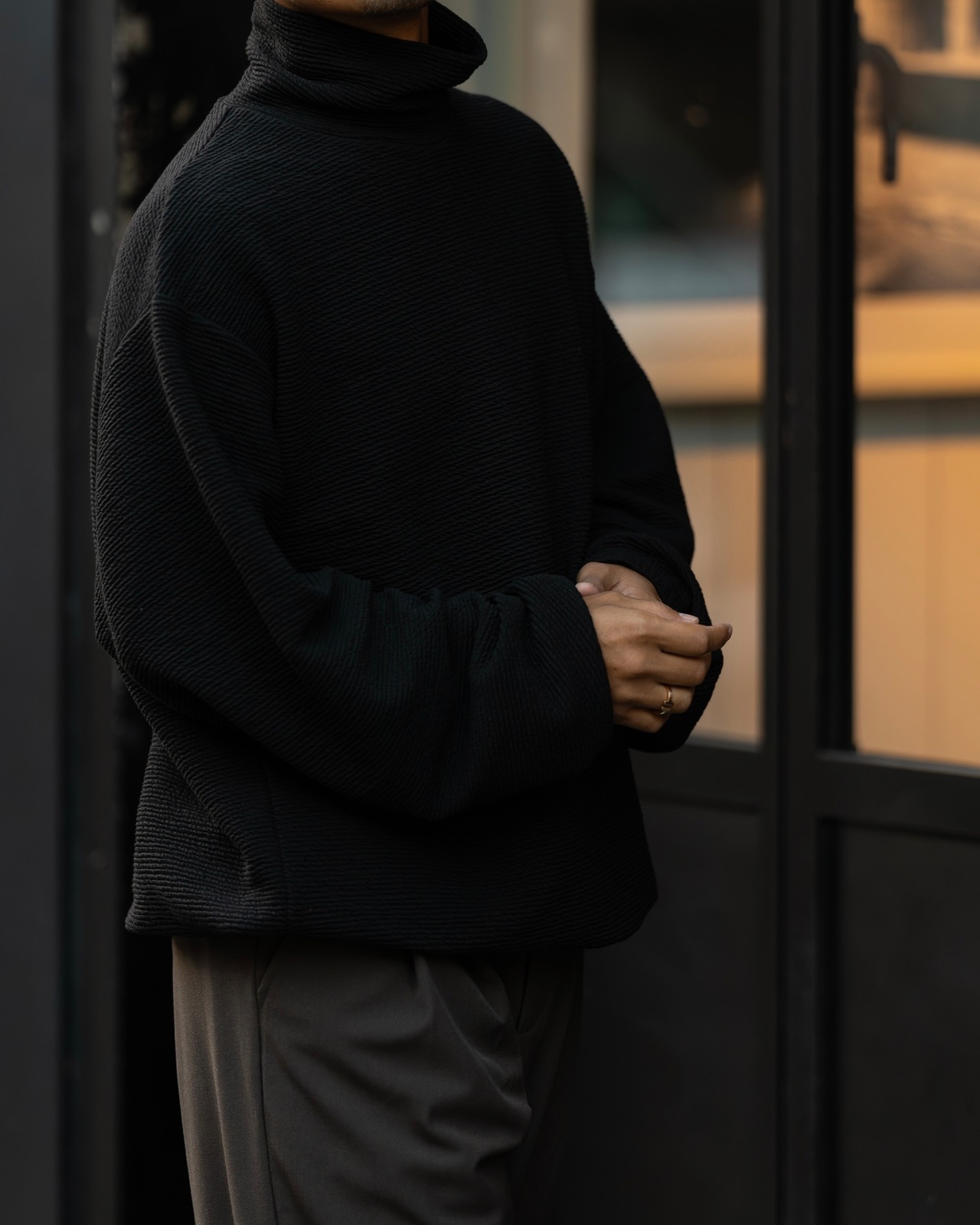 タートルネック風の襟高にゆとりを持たせたネックラインは、くしゅっとしたルーズな表情を生み出し、1枚でもインナーでも活躍する万能な一着です。