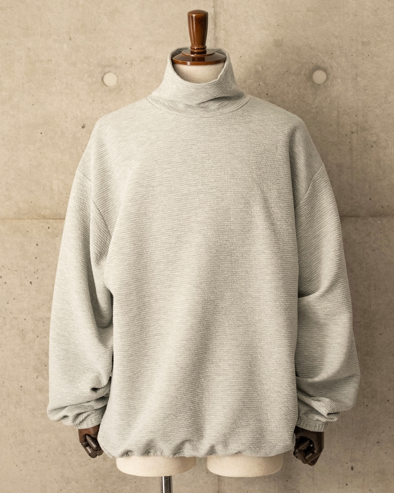 タートルネック風の襟高にゆとりを持たせたネックラインは、くしゅっとしたルーズな表情を生み出し、1枚でもインナーでも活躍する万能な一着です。