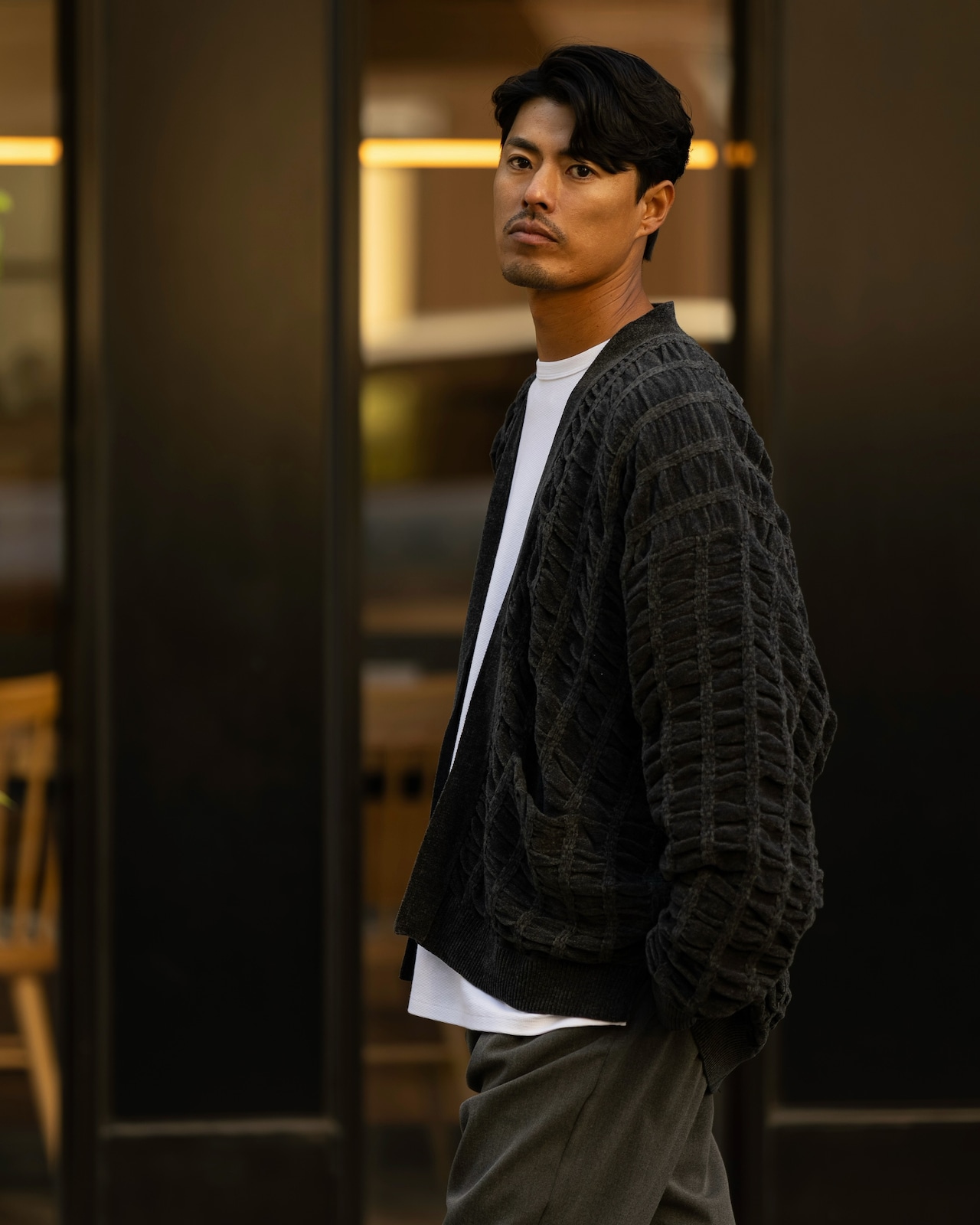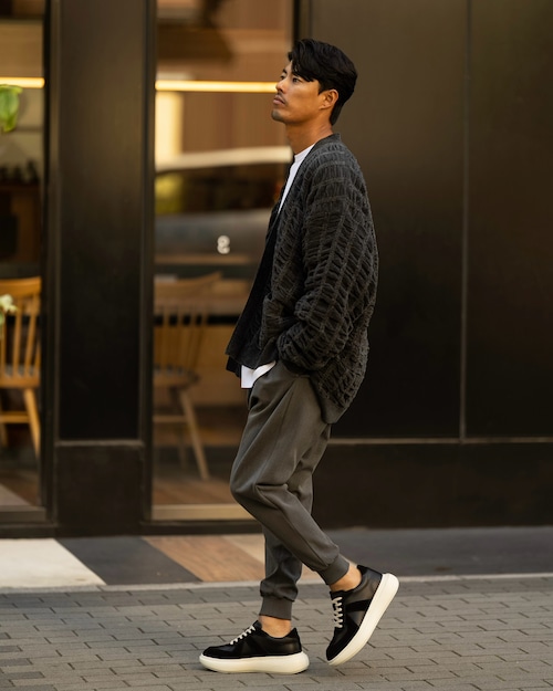 シンプルながらも奥行きを感じさせる編み地と、ボタンレスのミニマルなデザインが融合。