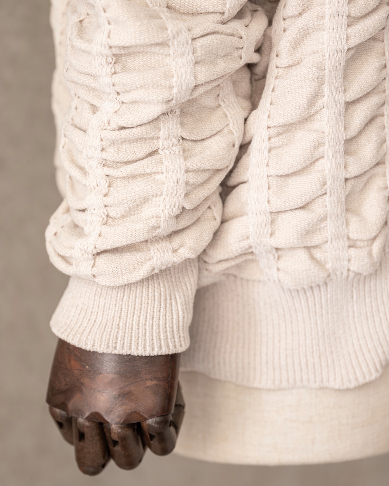 モール糸を使用したフクレジャガード編みが奥行きのある立体感を生み出し、動きのある豊かな表情を演出。