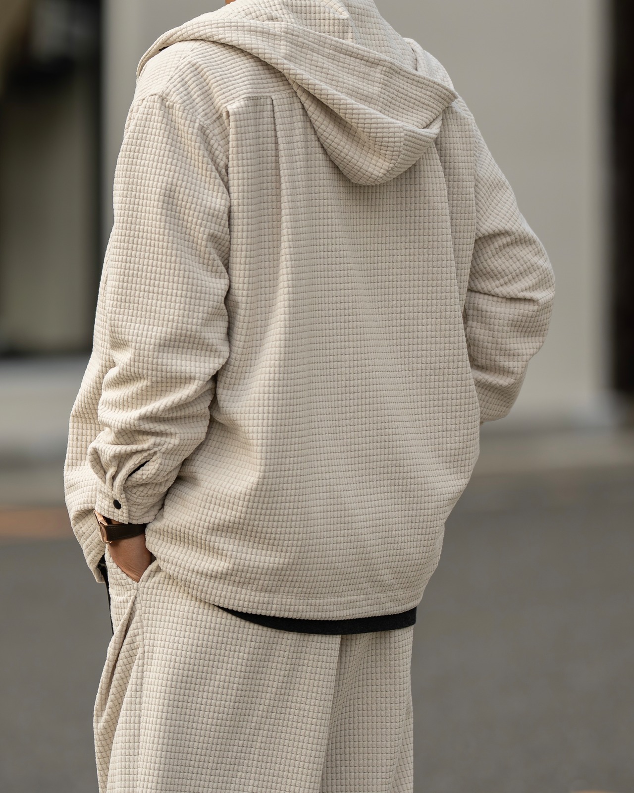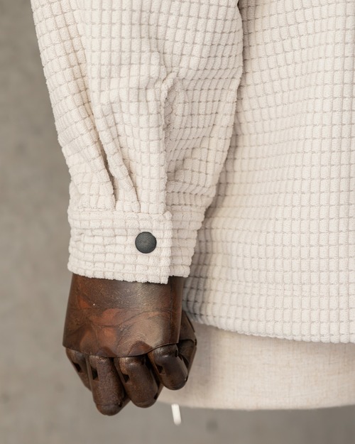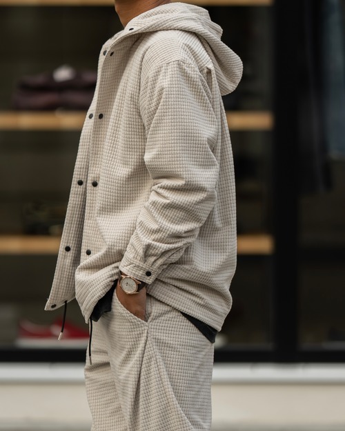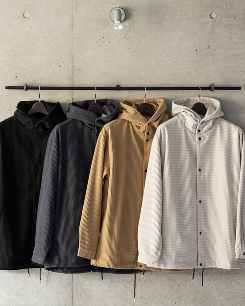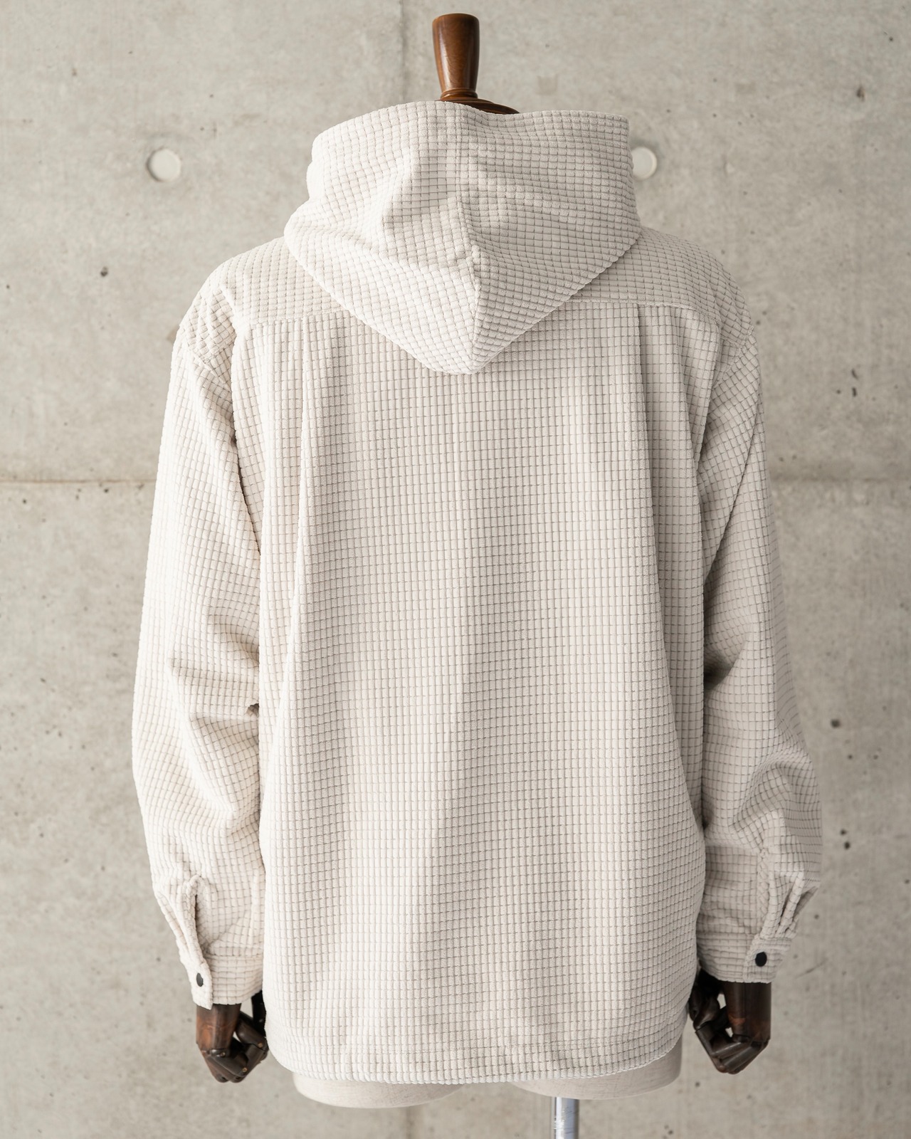 起毛感と凹凸のある表情が魅力のワッフル織りコーデュロイ生地のフーディーシャツ