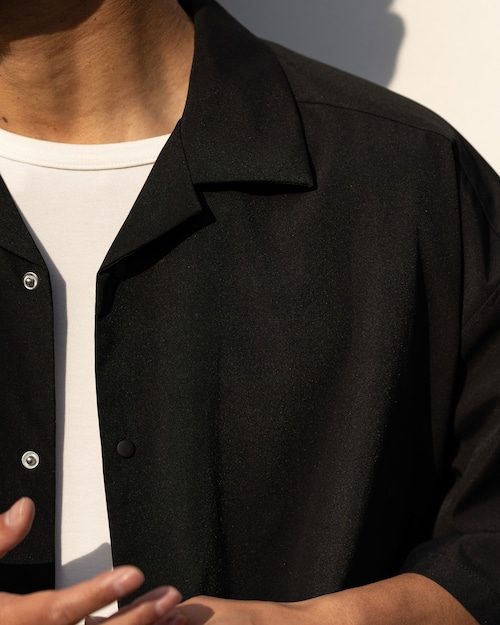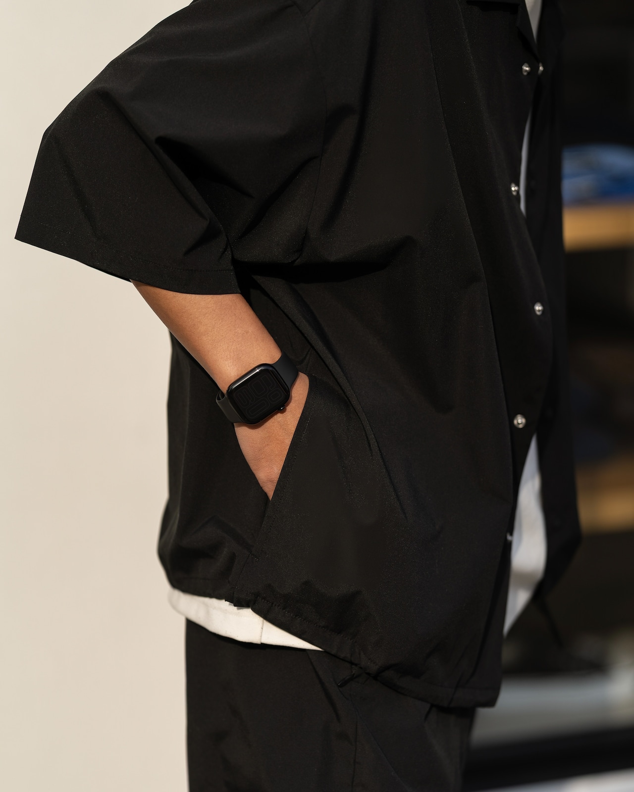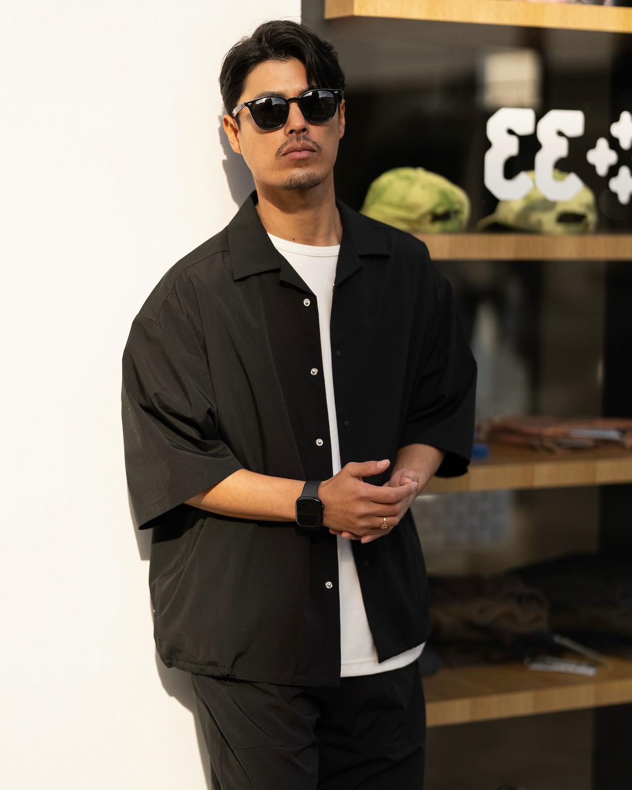 スポーティーな印象の高密度織りポリエステルファブリックのオープンカラーシャツ。