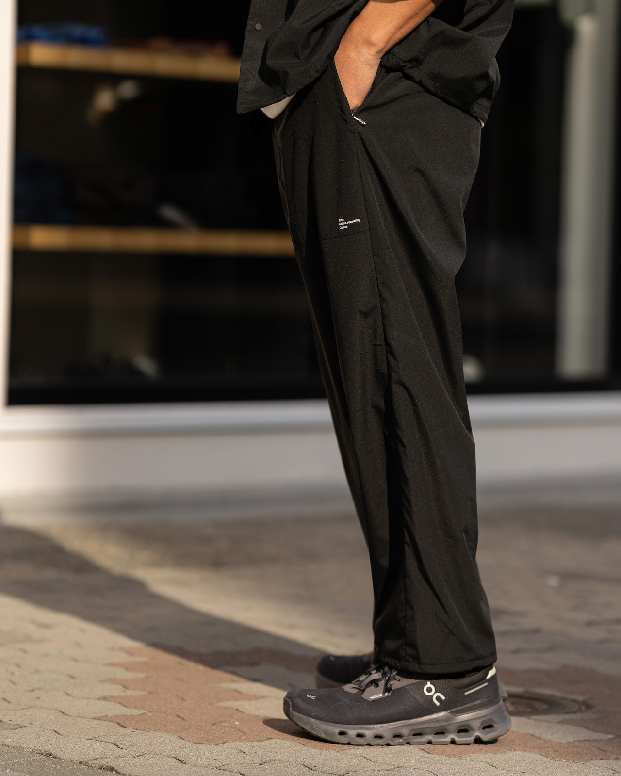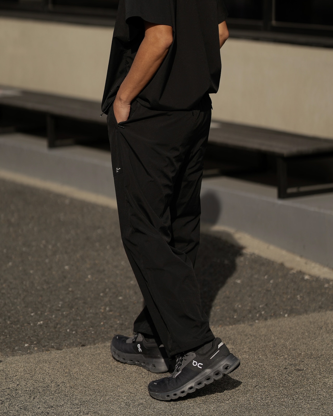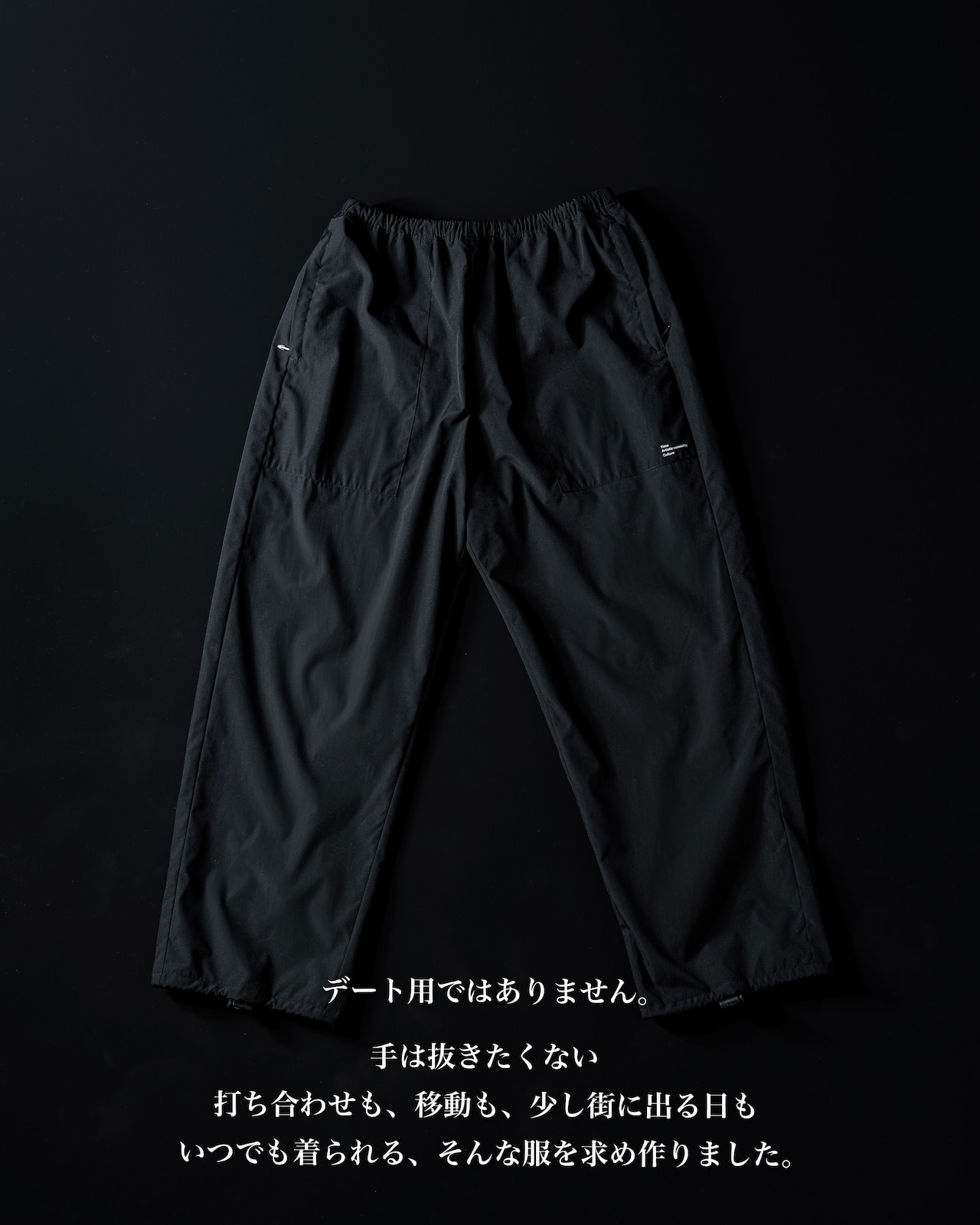 フロント右腿辺りにミニマルなロゴプリントを配置。