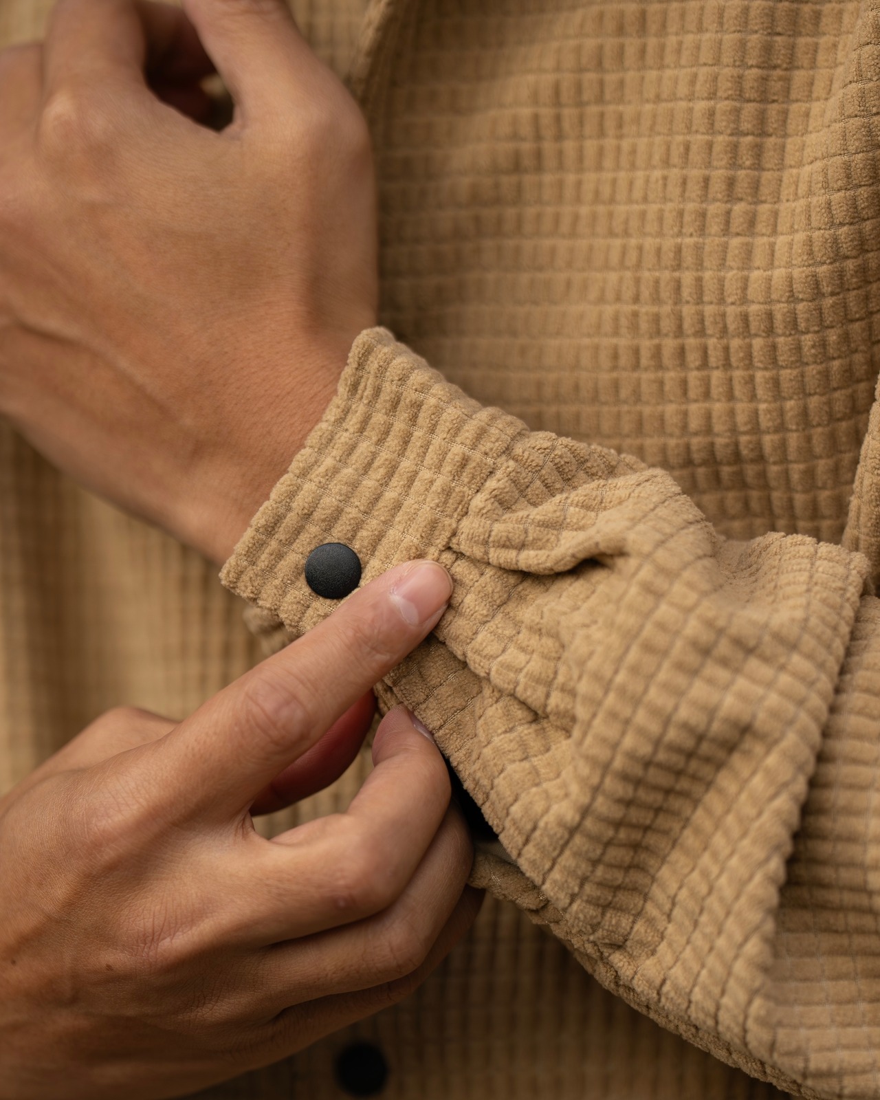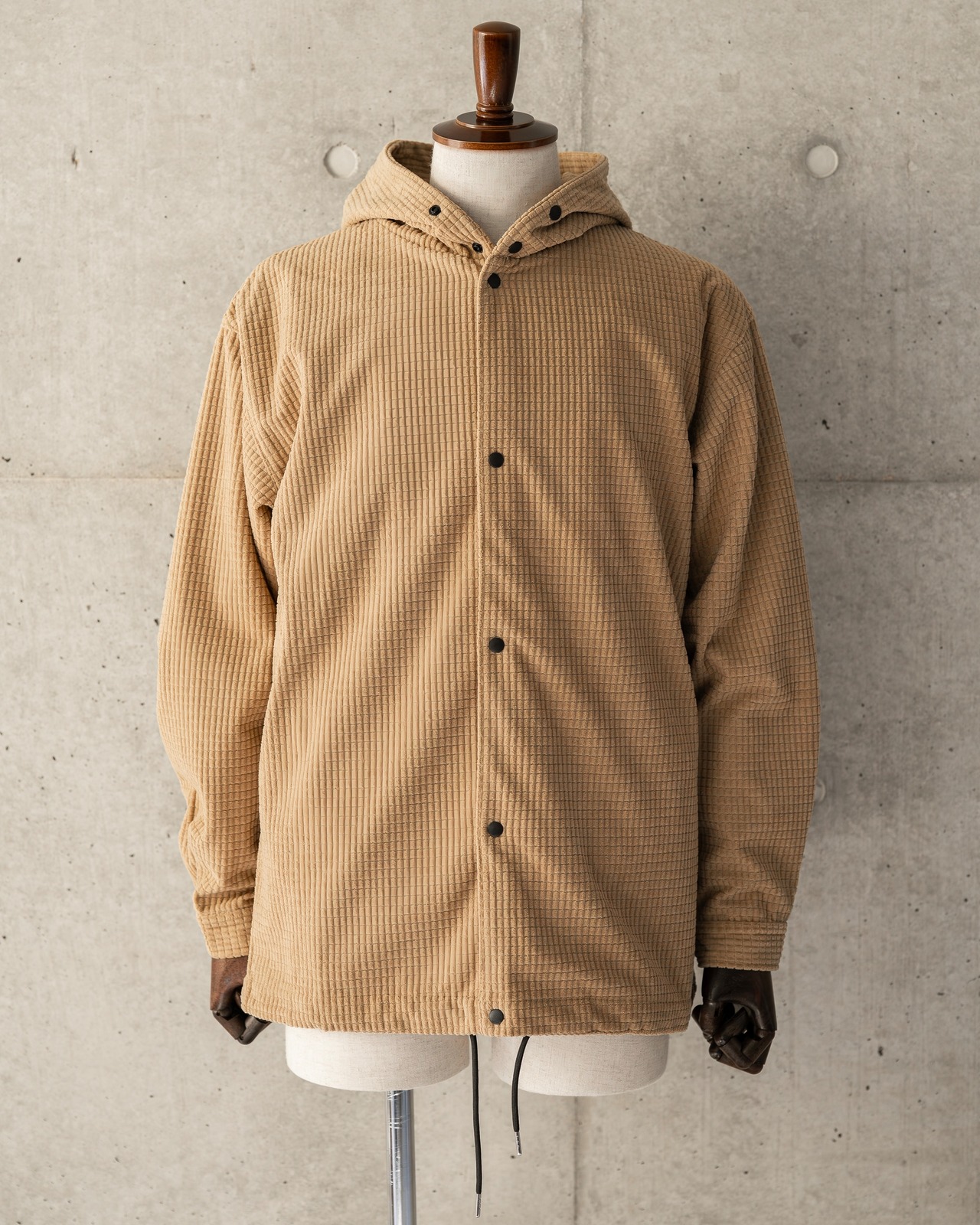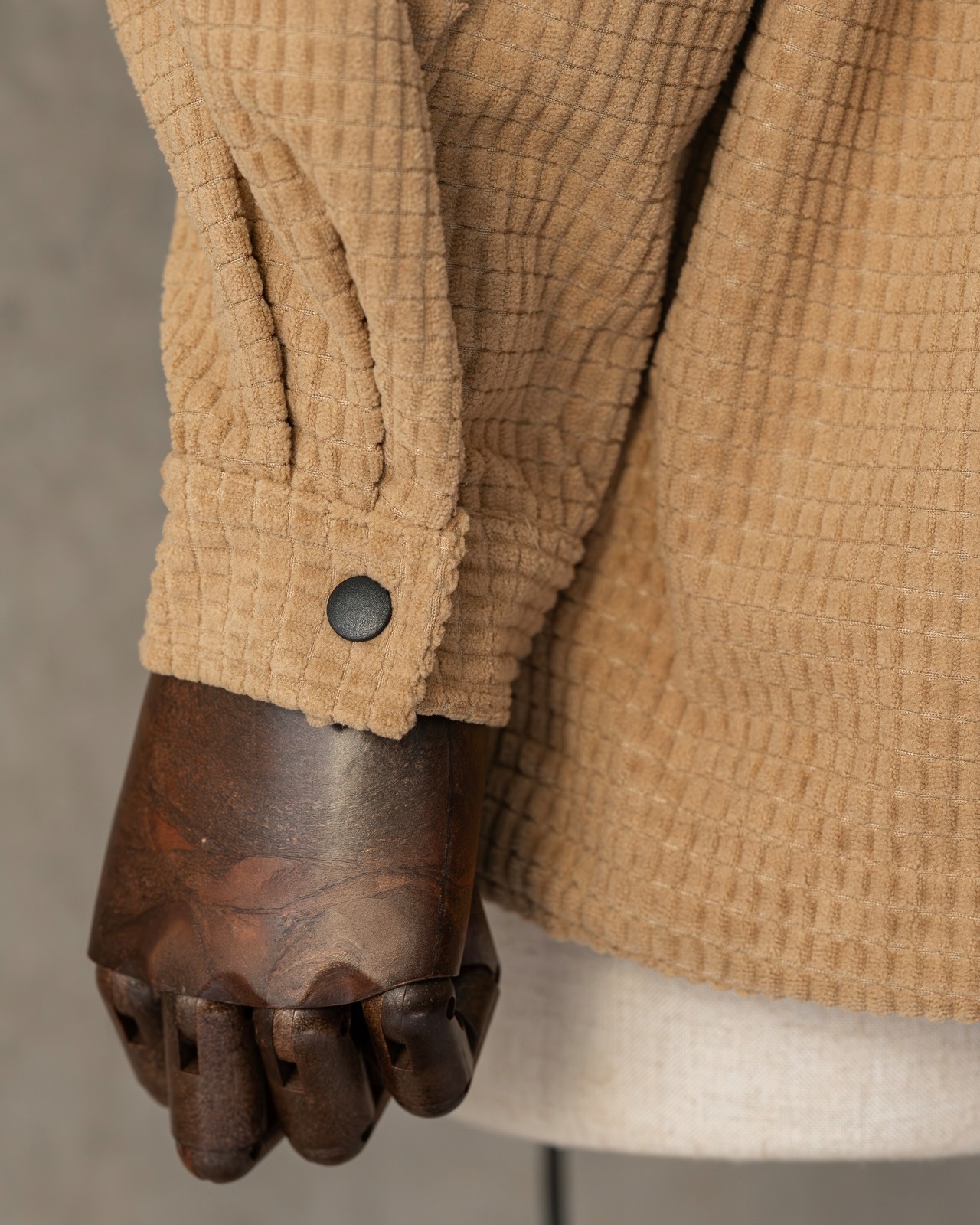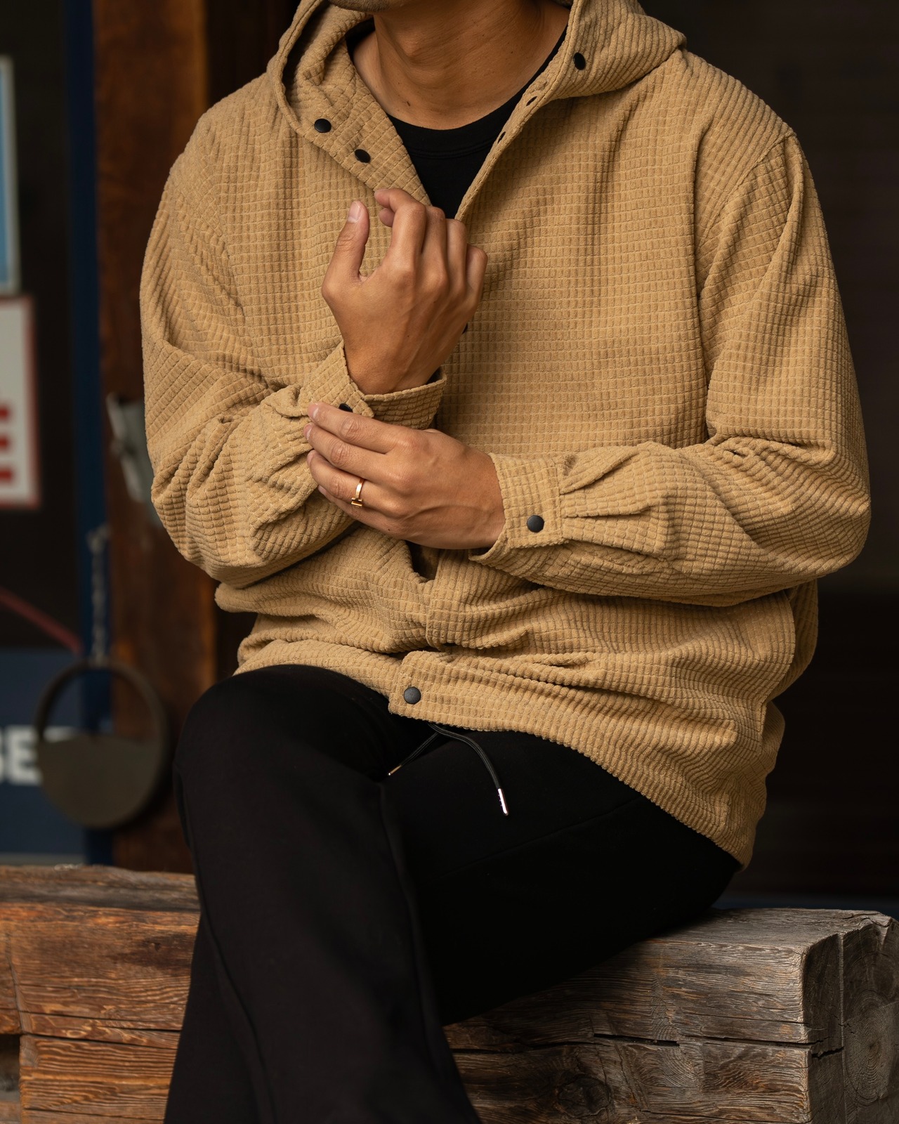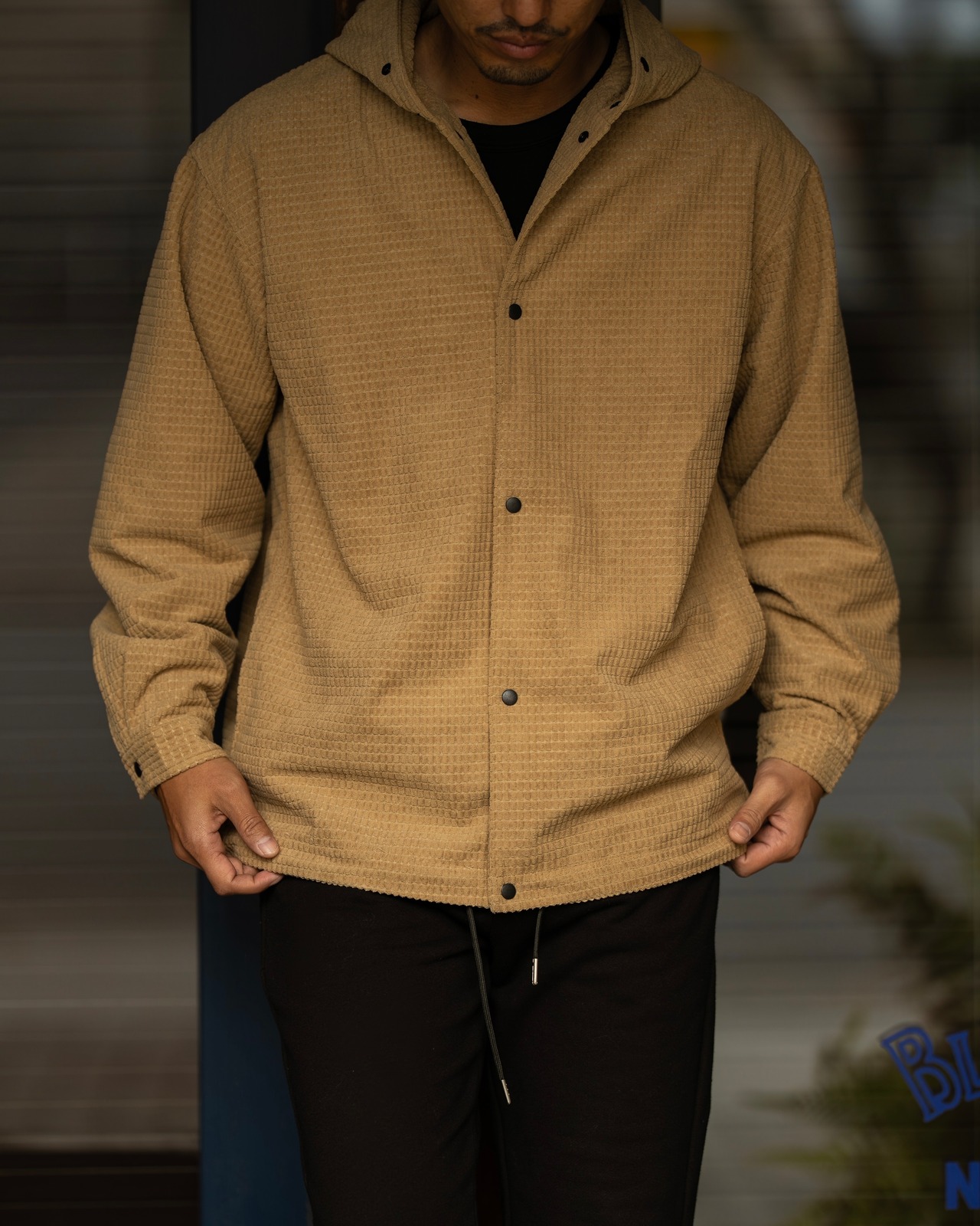 起毛感と凹凸のある表情が魅力のワッフル織りコーデュロイ生地のフーディーシャツ