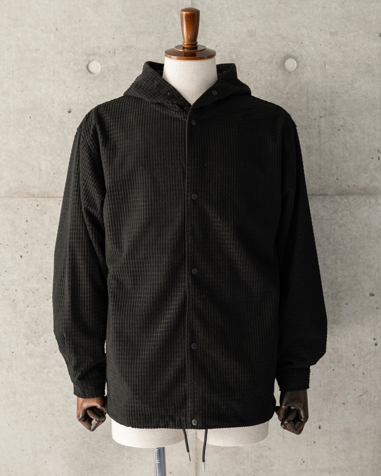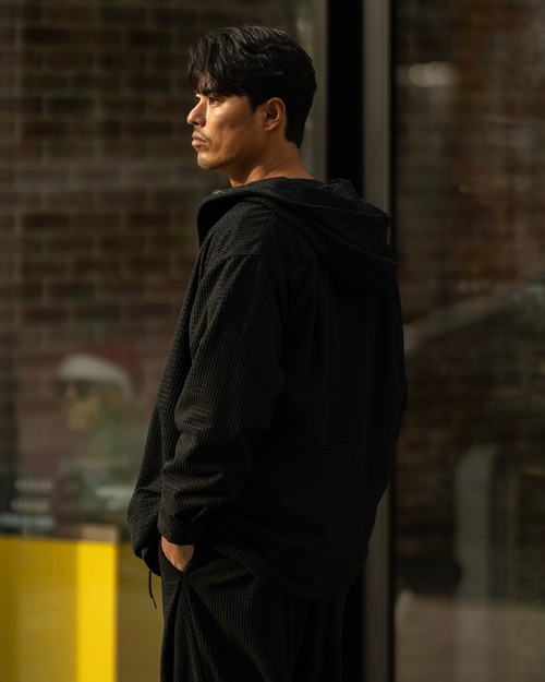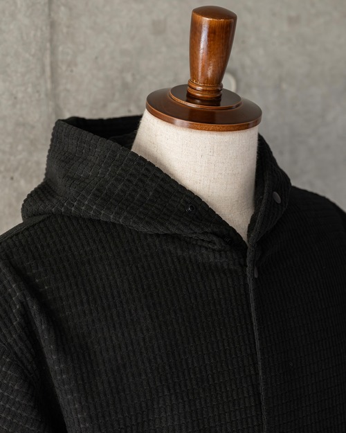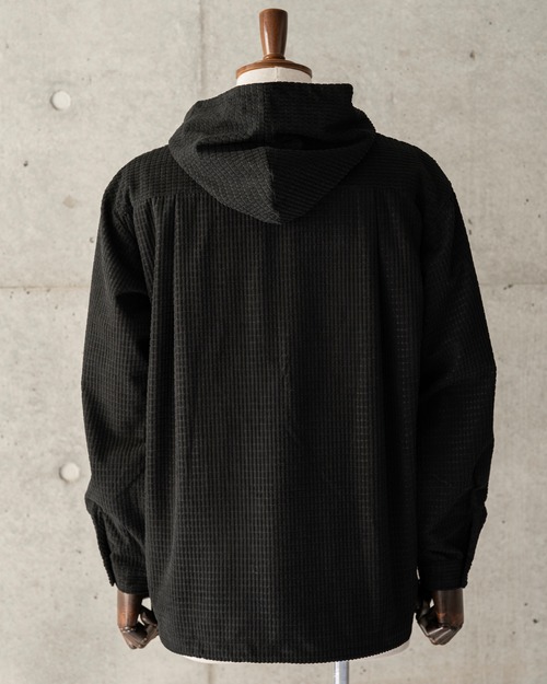 起毛感と凹凸のある表情が魅力のワッフル織りコーデュロイ生地のフーディーシャツ