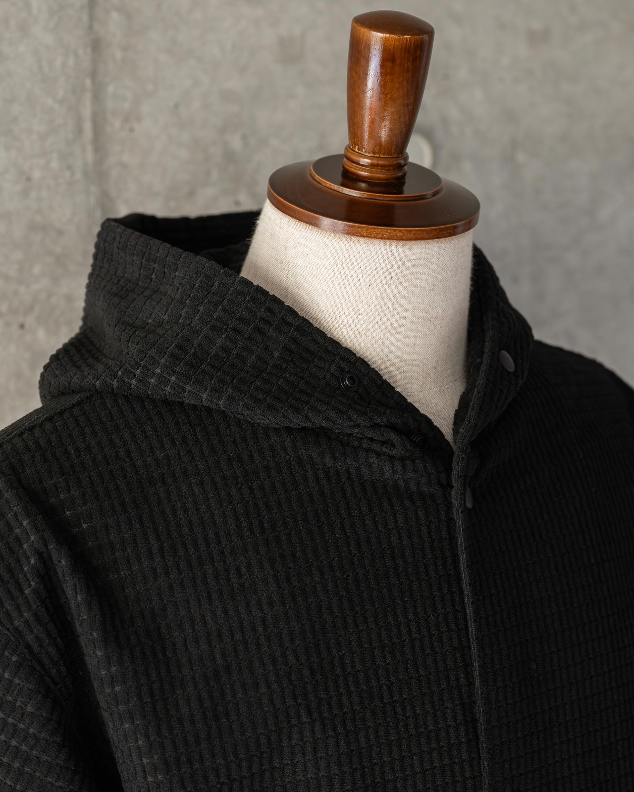 フード部にはあご下までボタンを配したフーデッドディテール。