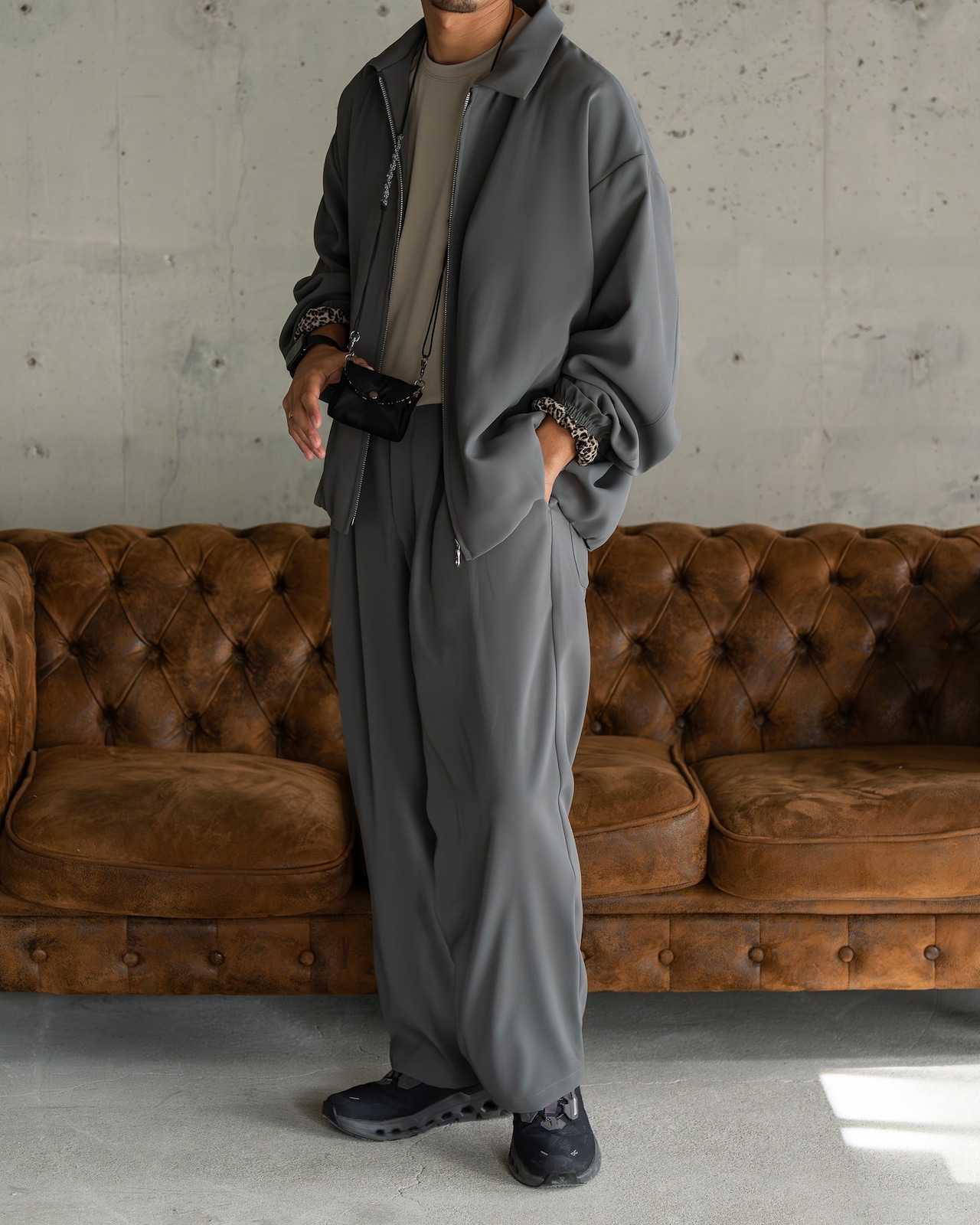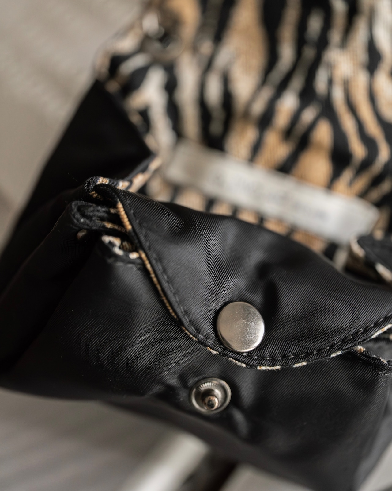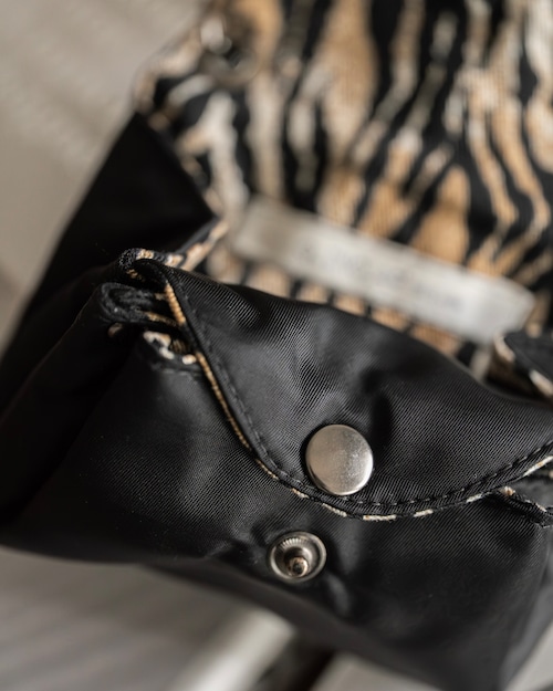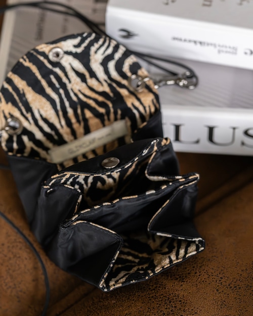 裏地にレオパード柄のライニングが施されており、シンプルな外観とのギャップが目を引くアクセント。