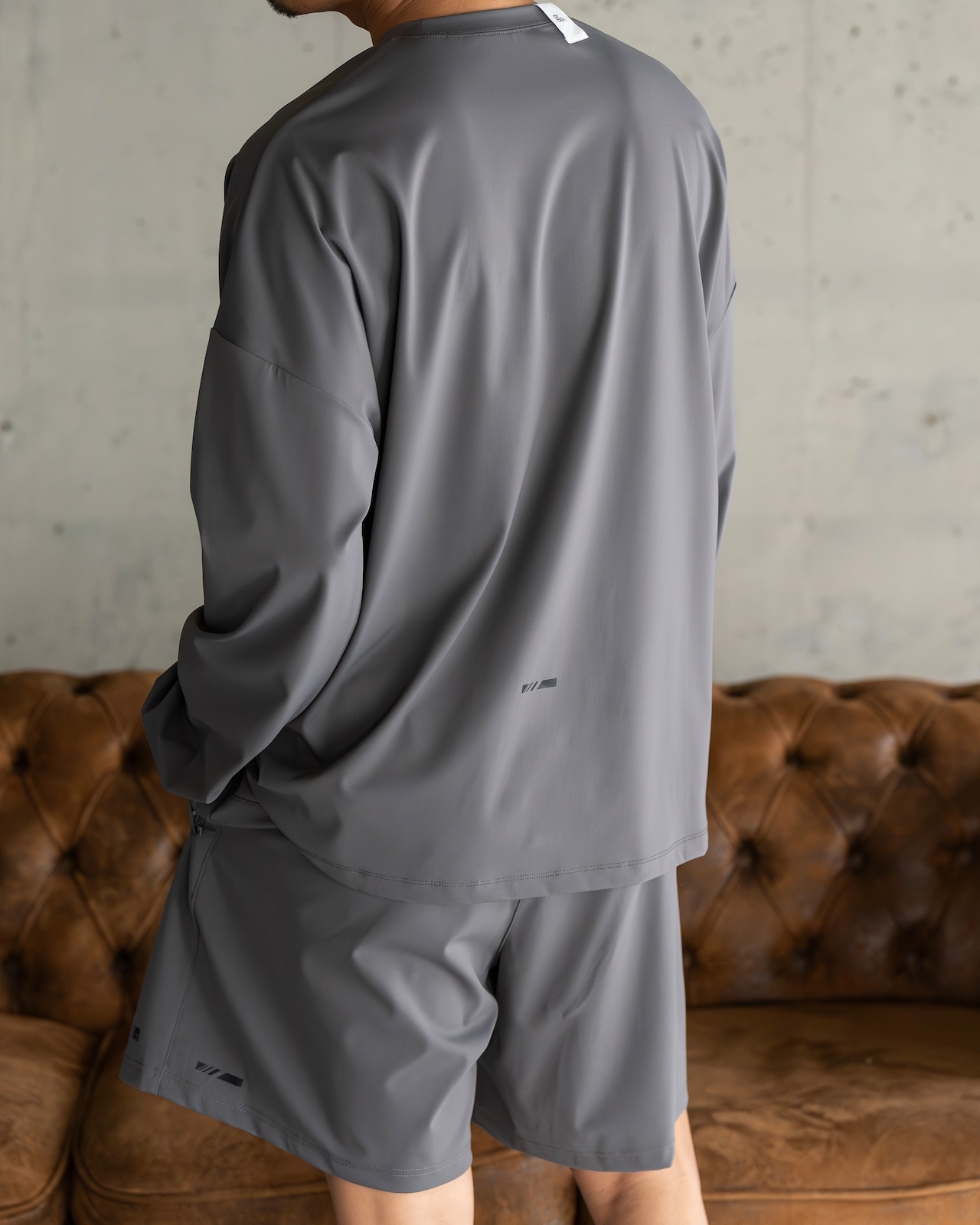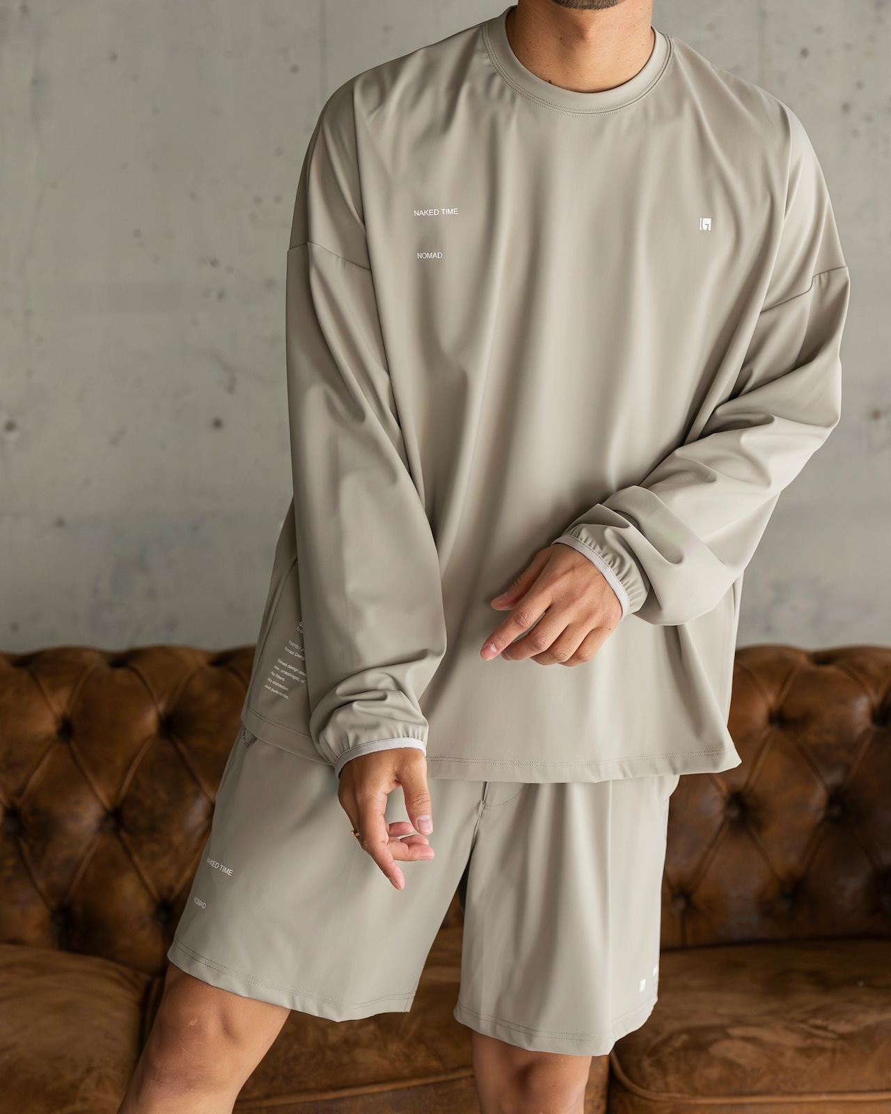 同素材のトップス[201-026-gls-cg][201-028-gls-cg]とのセットアップにも対応し、洗練された統一感のあるスタイリングが可能な一枚です。