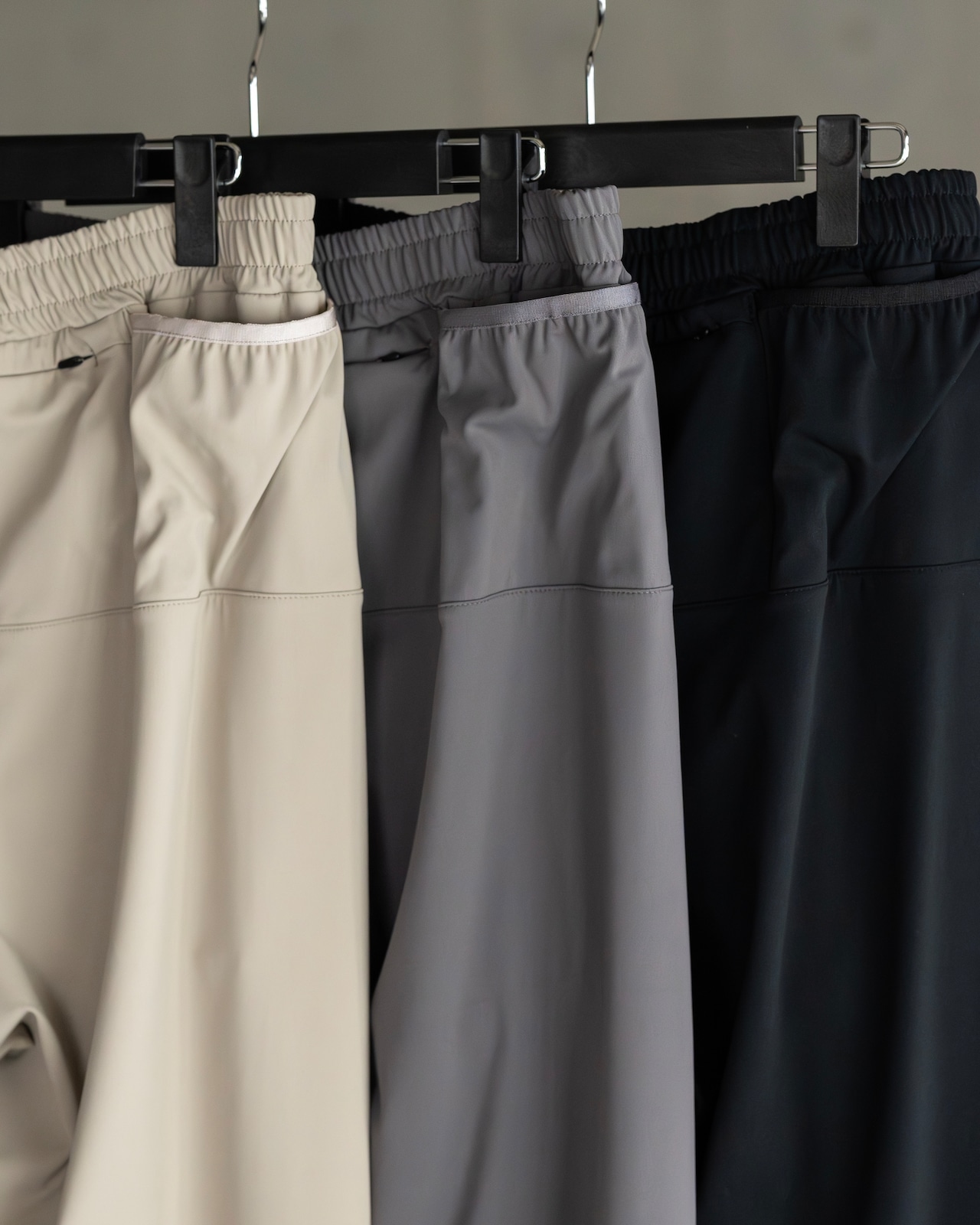 ウエストは平ゴムとスピンドルを配したイージー仕様に加えファスナーを配した仕様。