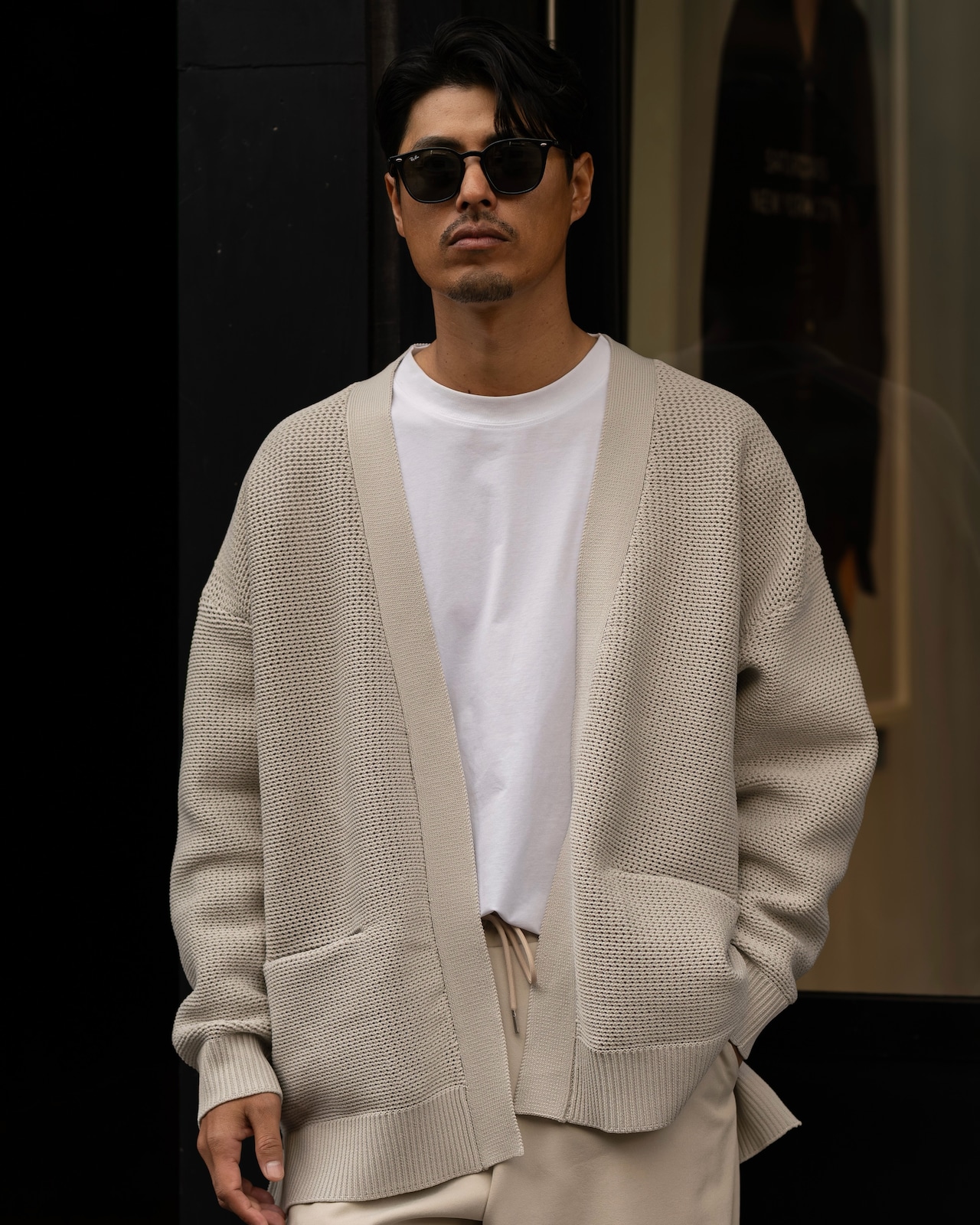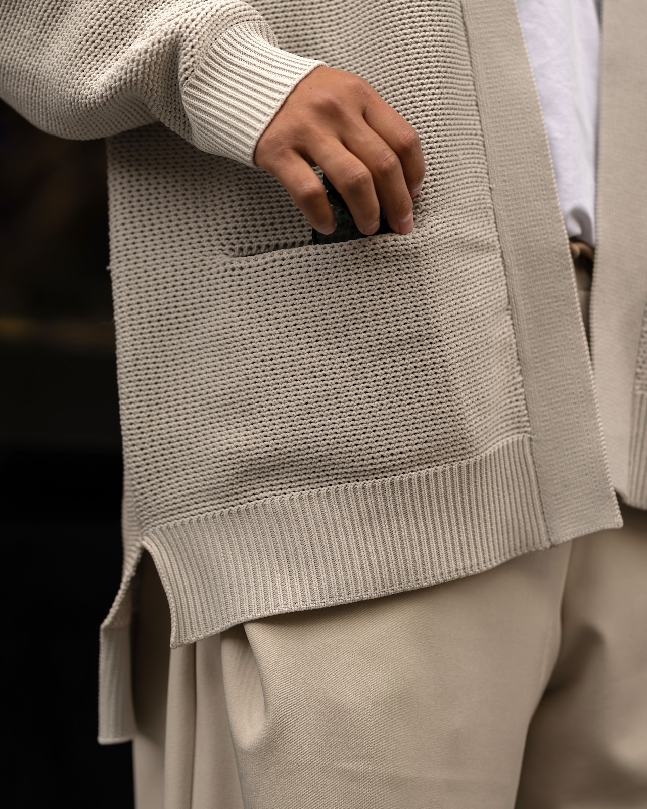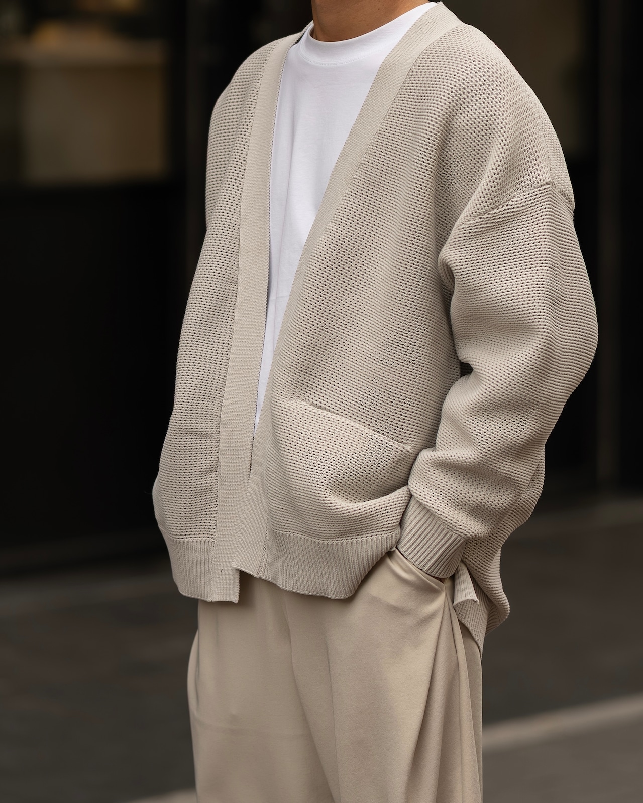 シンプルながらも奥行きを感じさせる編み地と、ボタンレスのミニマルなデザインが融合。