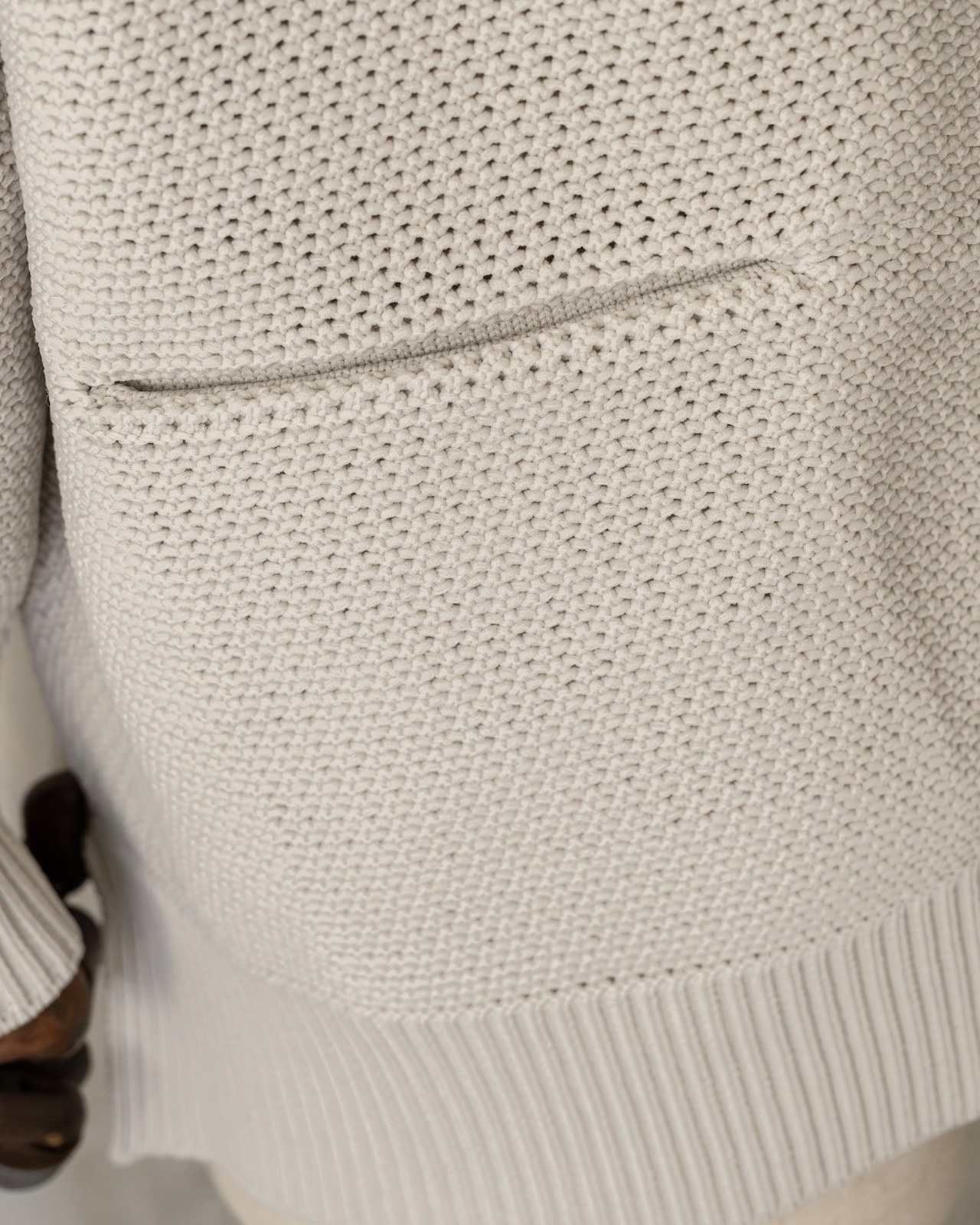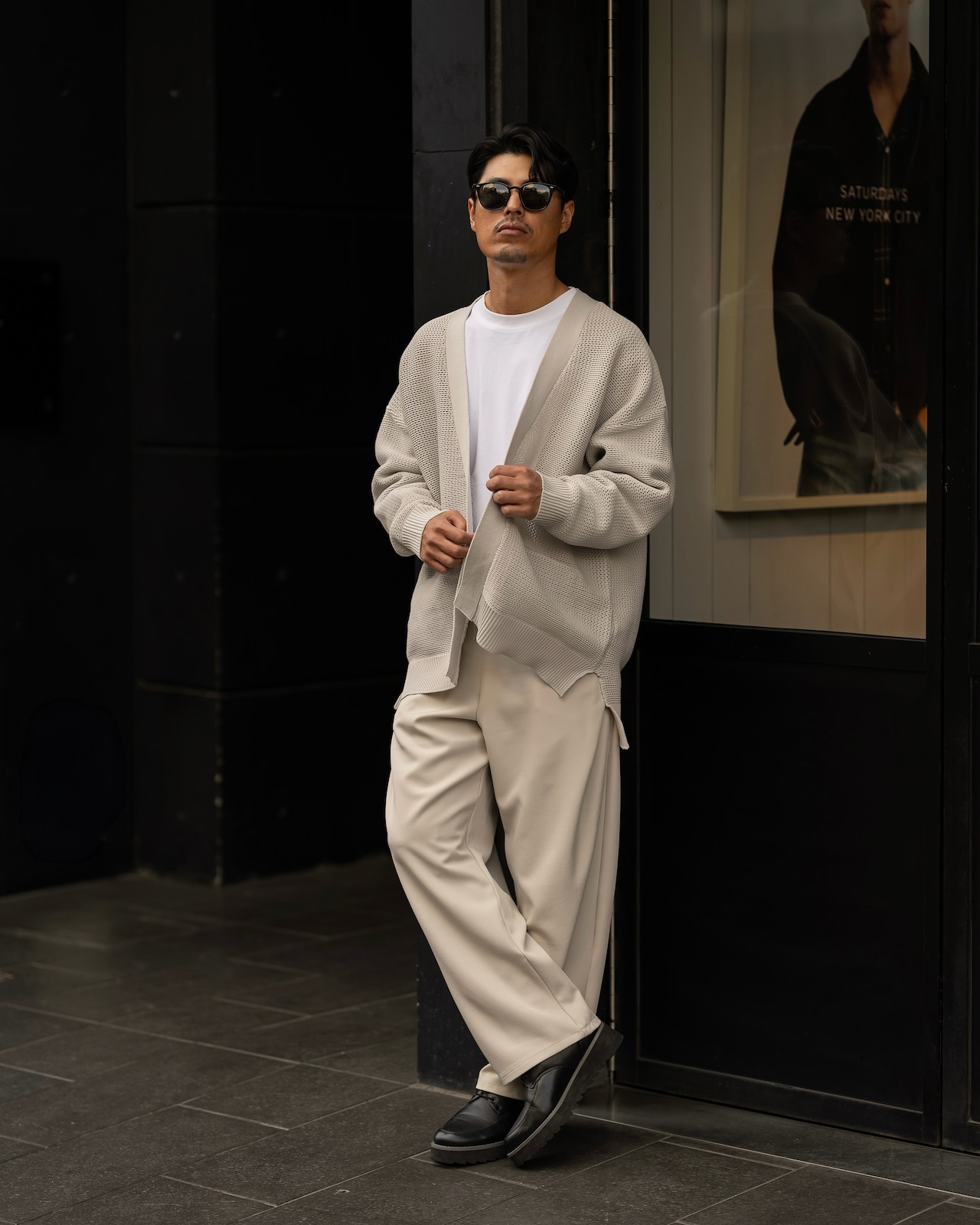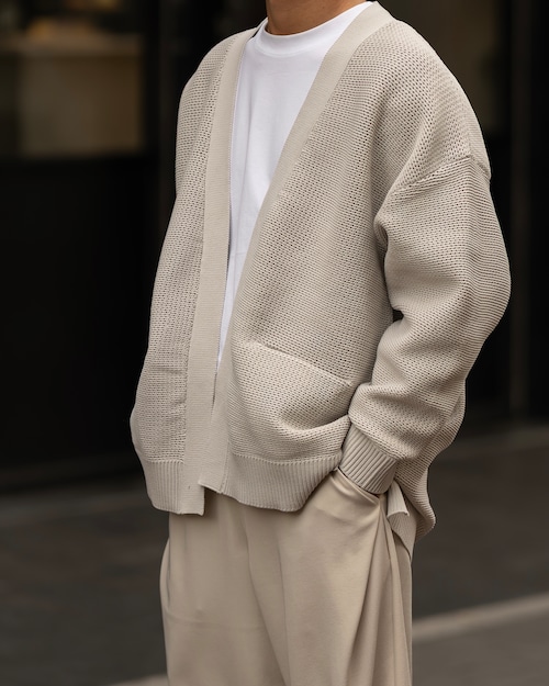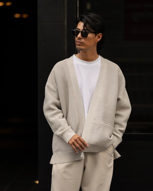 シンプルながらも奥行きを感じさせる編み地と、ボタンレスのミニマルなデザインが融合。