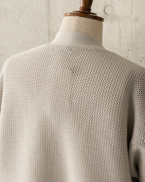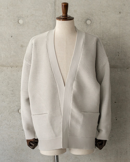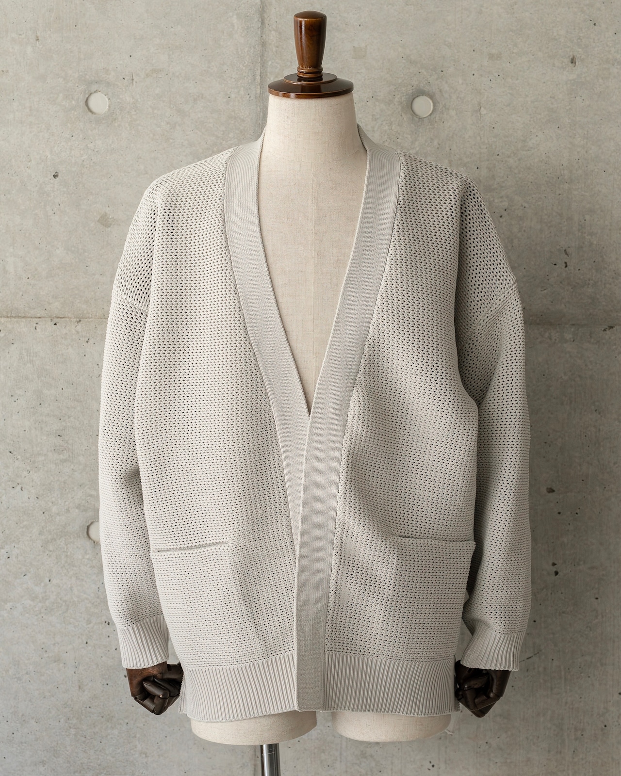 ポリエステル100%の糸で編み上げた、軽やかでクリーンな表情のニットカーディガン