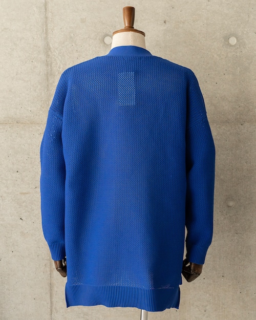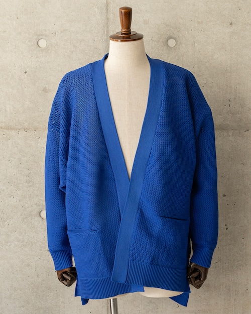 ポリエステル100%の糸で編み上げた、軽やかでクリーンな表情のニットカーディガン
