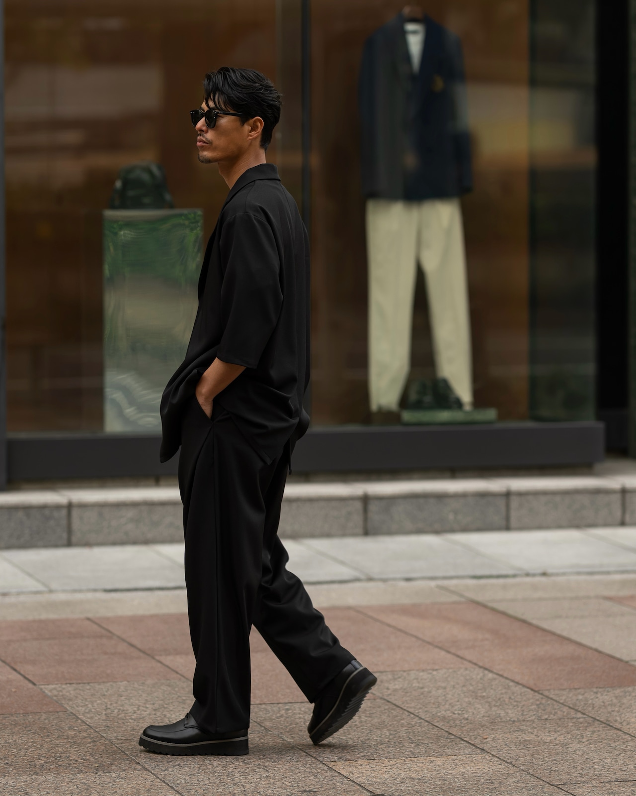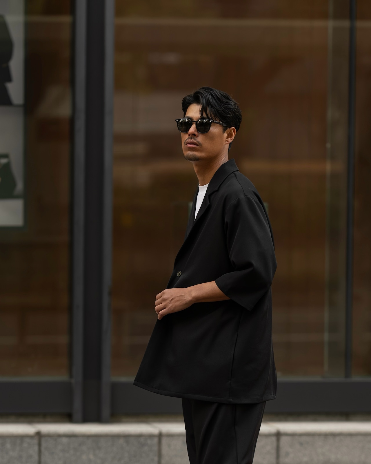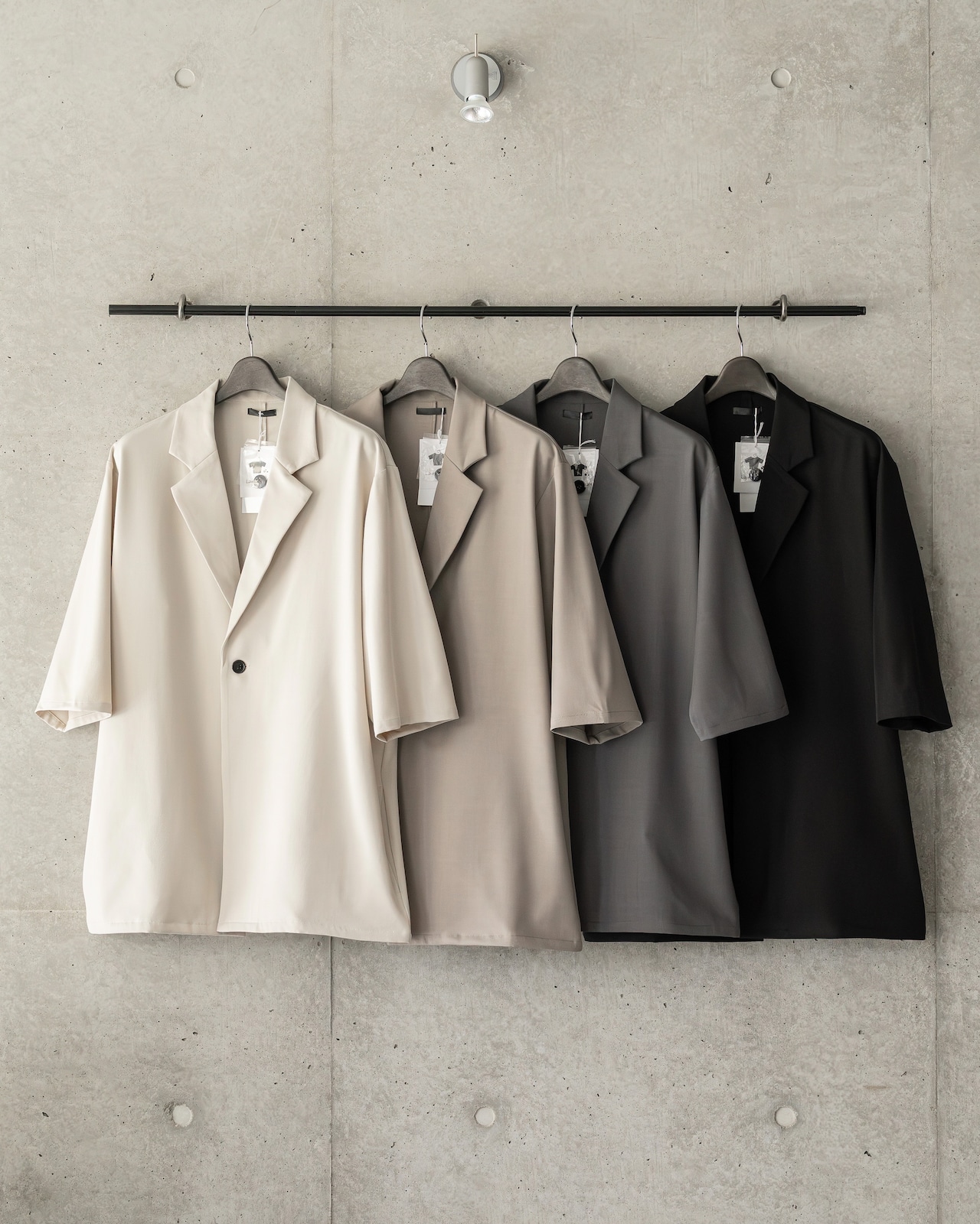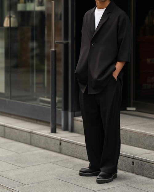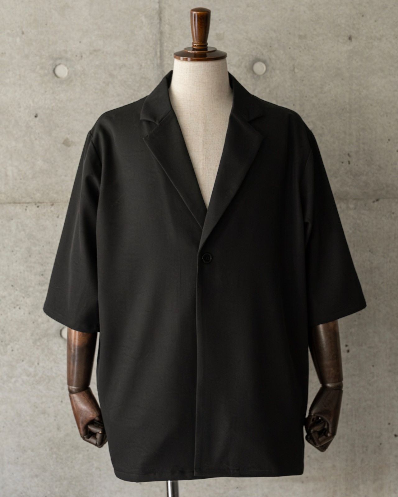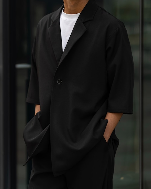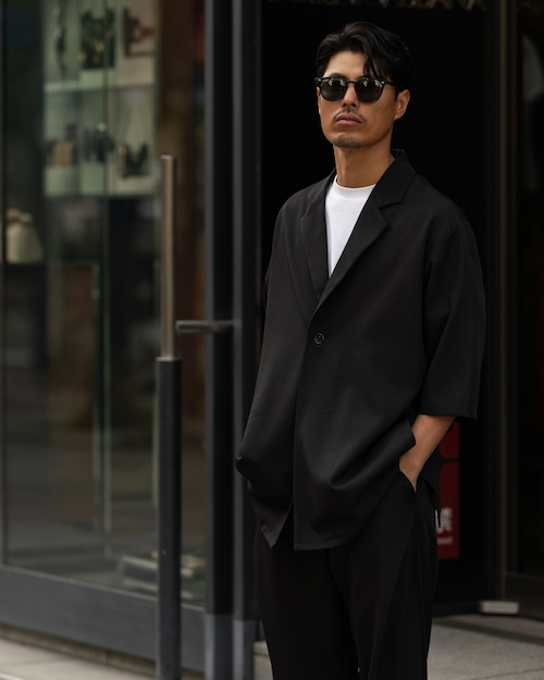 清涼感のあるポリエステルトロピカル素材を使用した、1B(1ボタン)仕様の半袖ジャケット