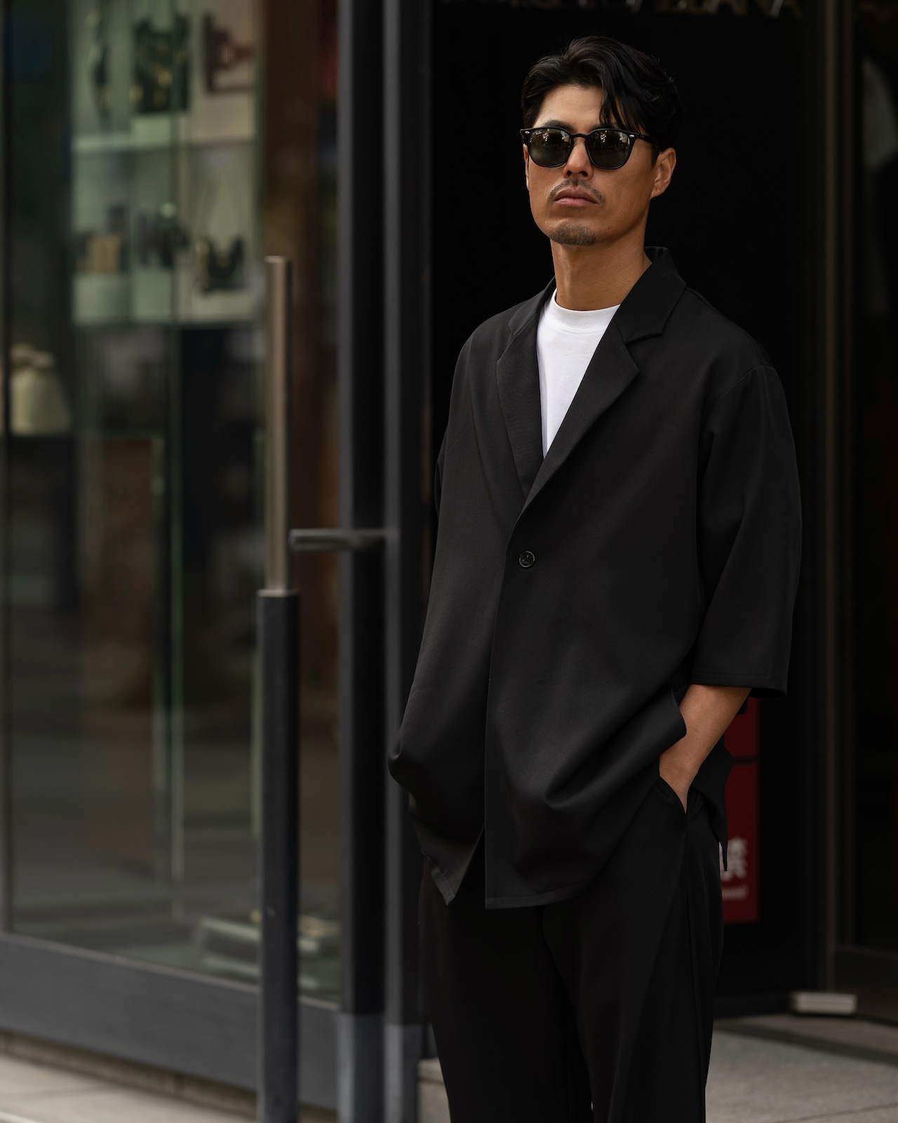 一見、半袖だけど肘が隠れるだけで落ち着きが出る