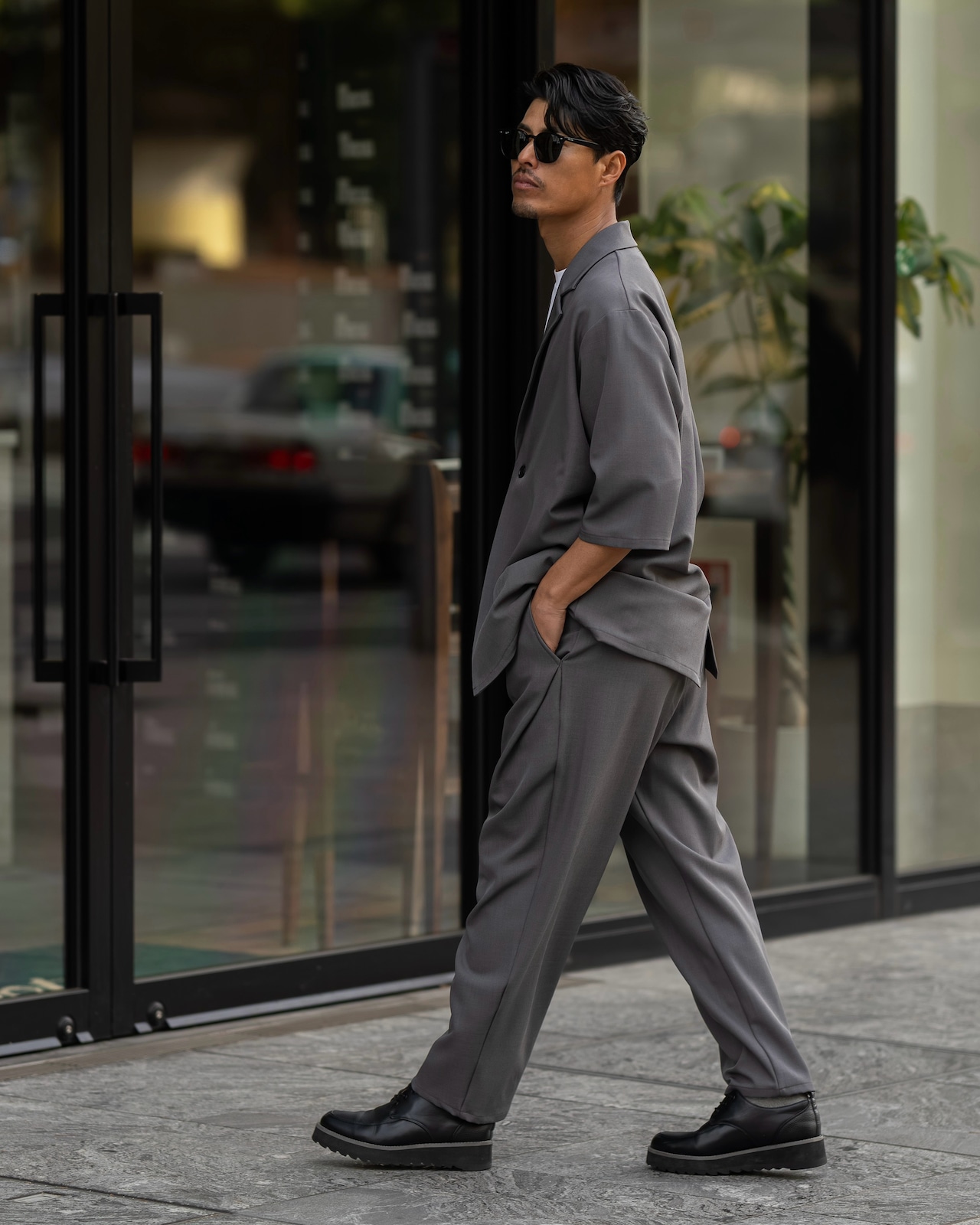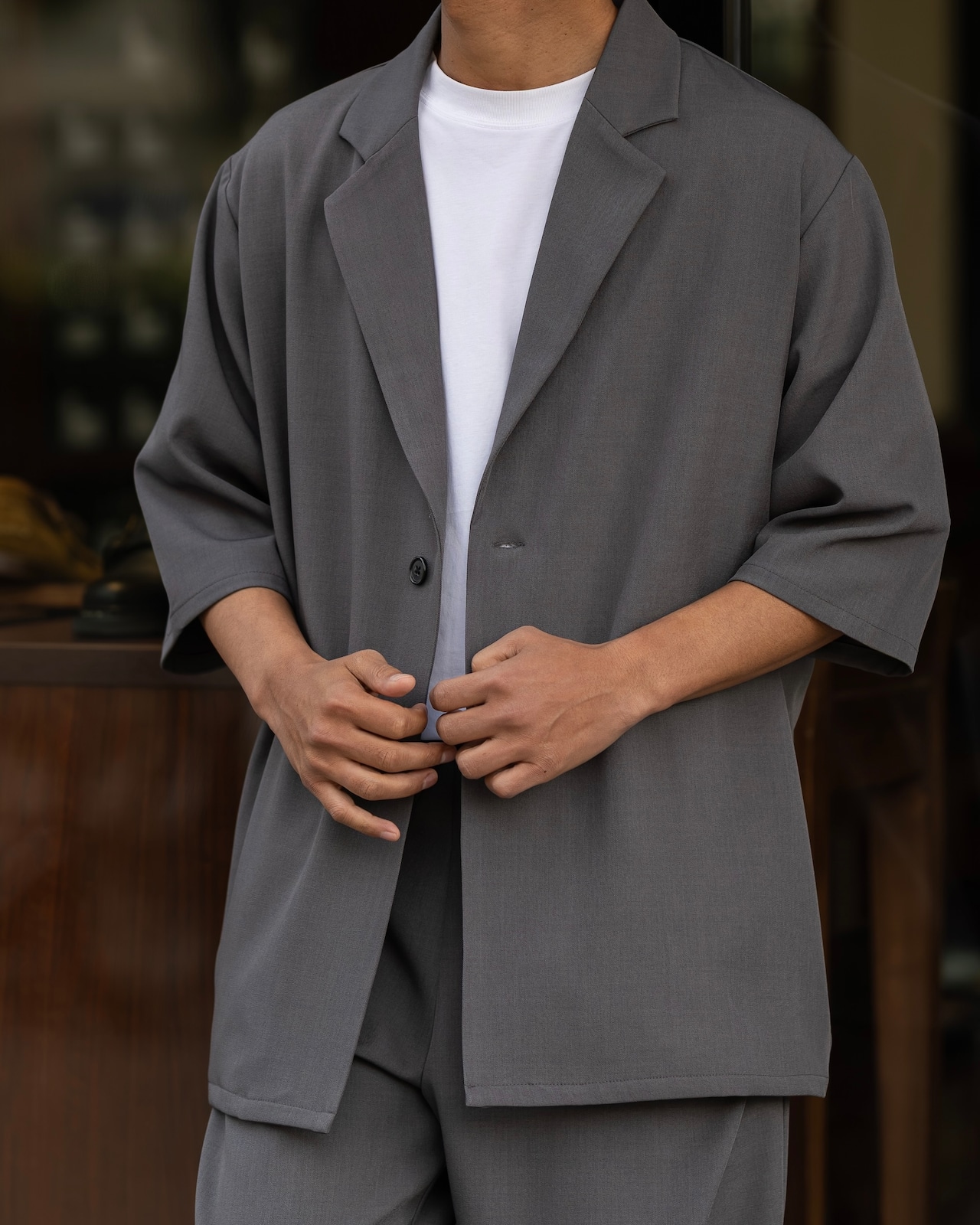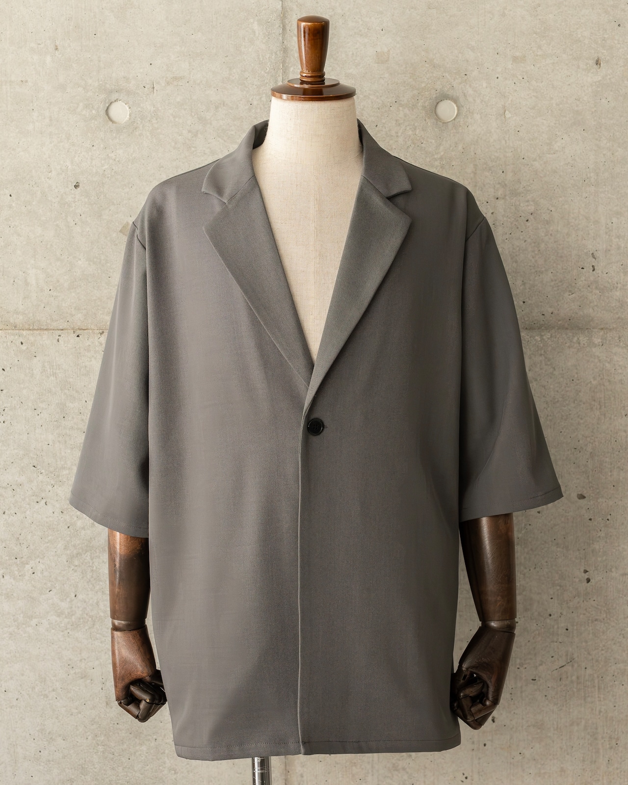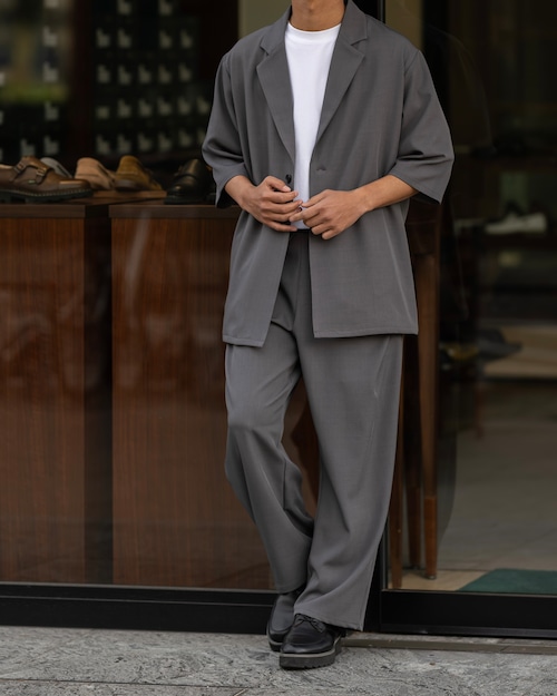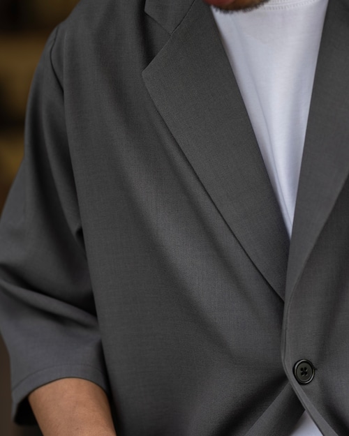 清涼感のあるポリエステルトロピカル素材を使用した、1B(1ボタン)仕様の半袖ジャケット