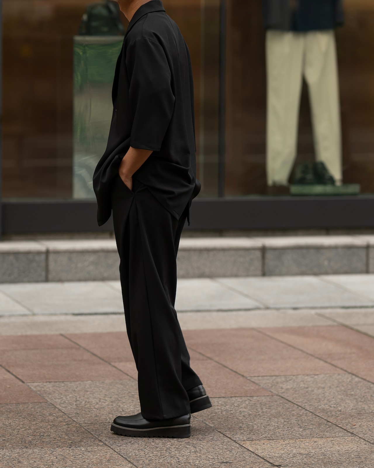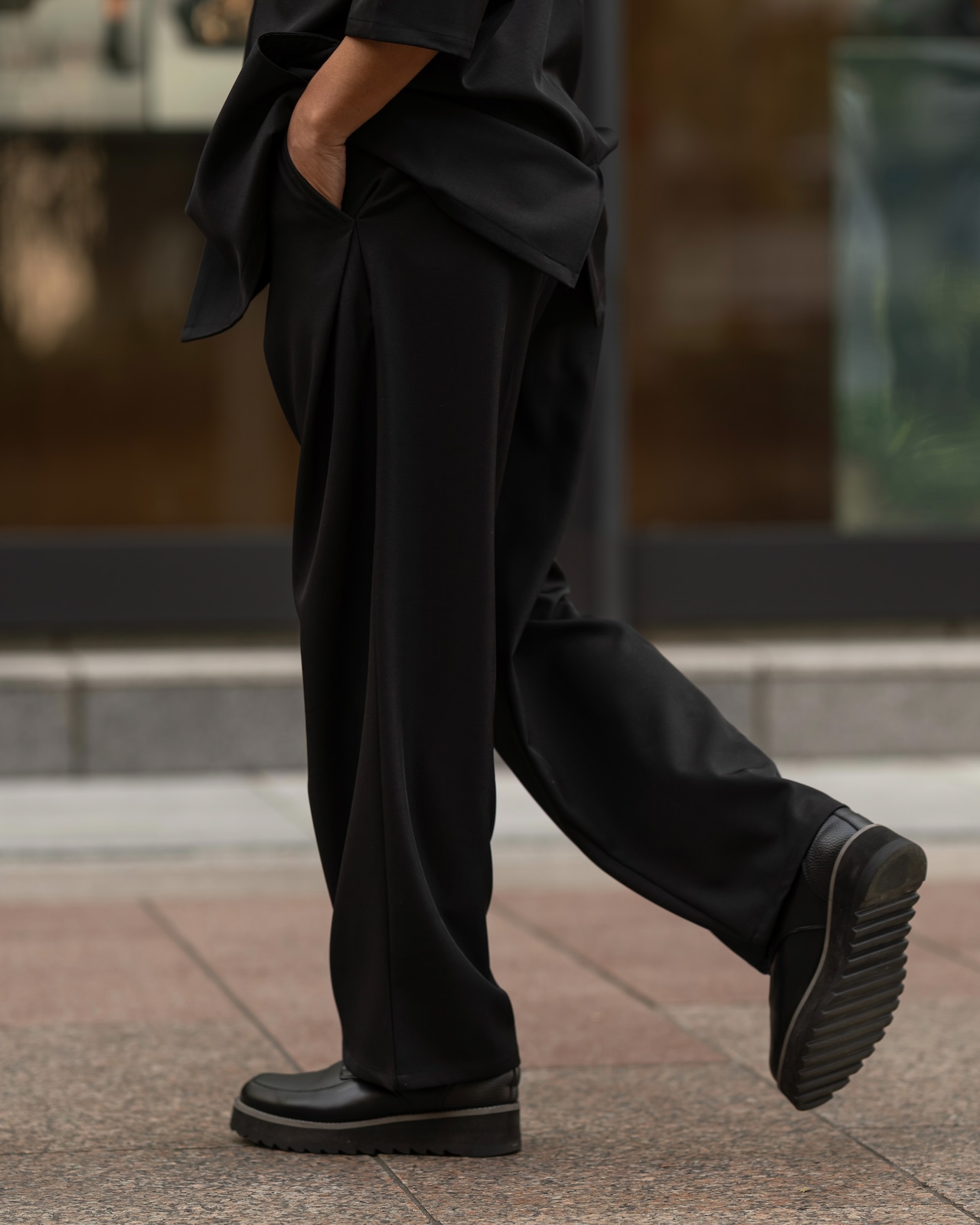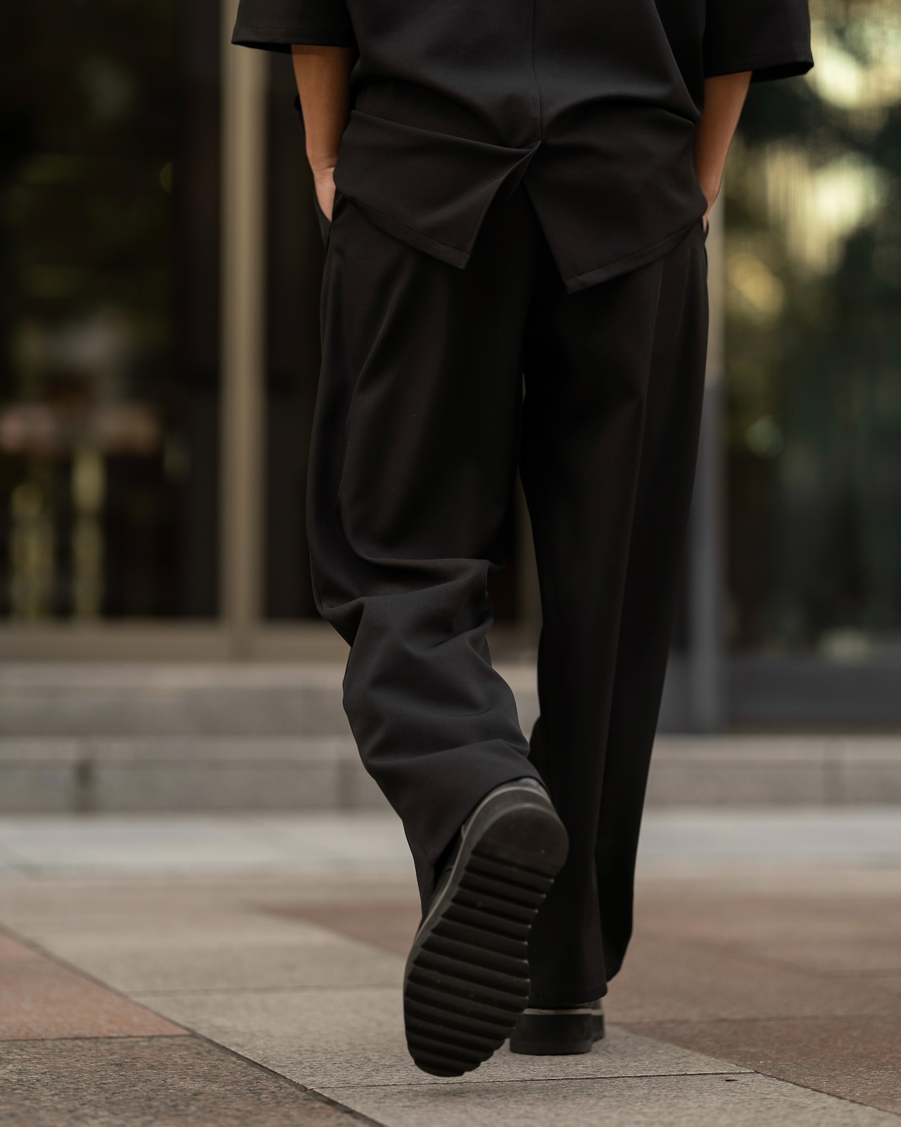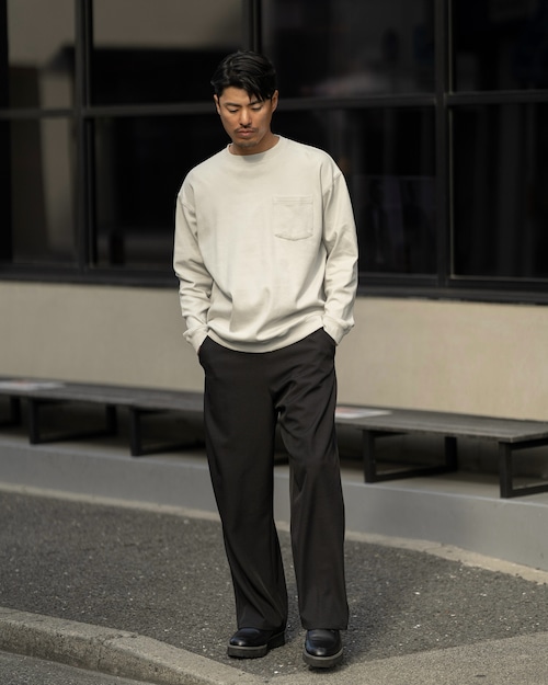 ワタリやヒップ周りにゆとりを持たせ、裾にかけてスッと落ちるボリュームのあるシルエットが、モードな雰囲気を演出。