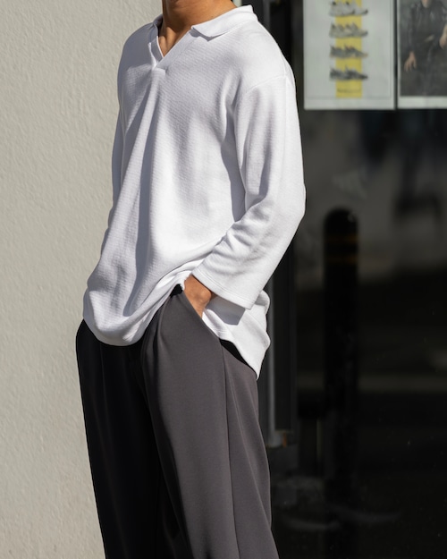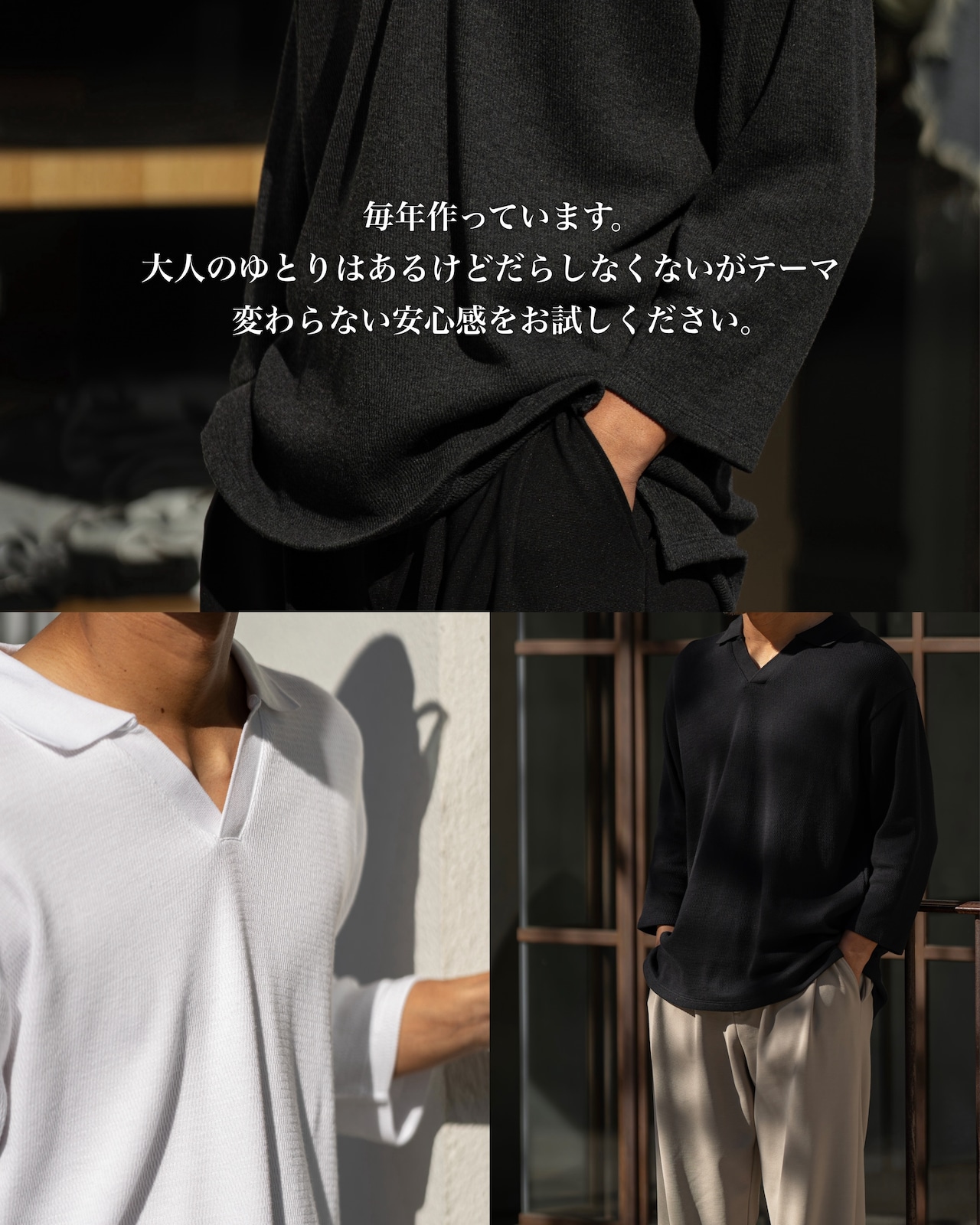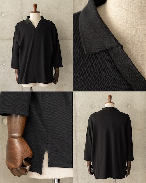 細かな凹凸が生む立体的な表情が魅力のハニカムワッフルを使った、七分袖スキッパーポロシャツ