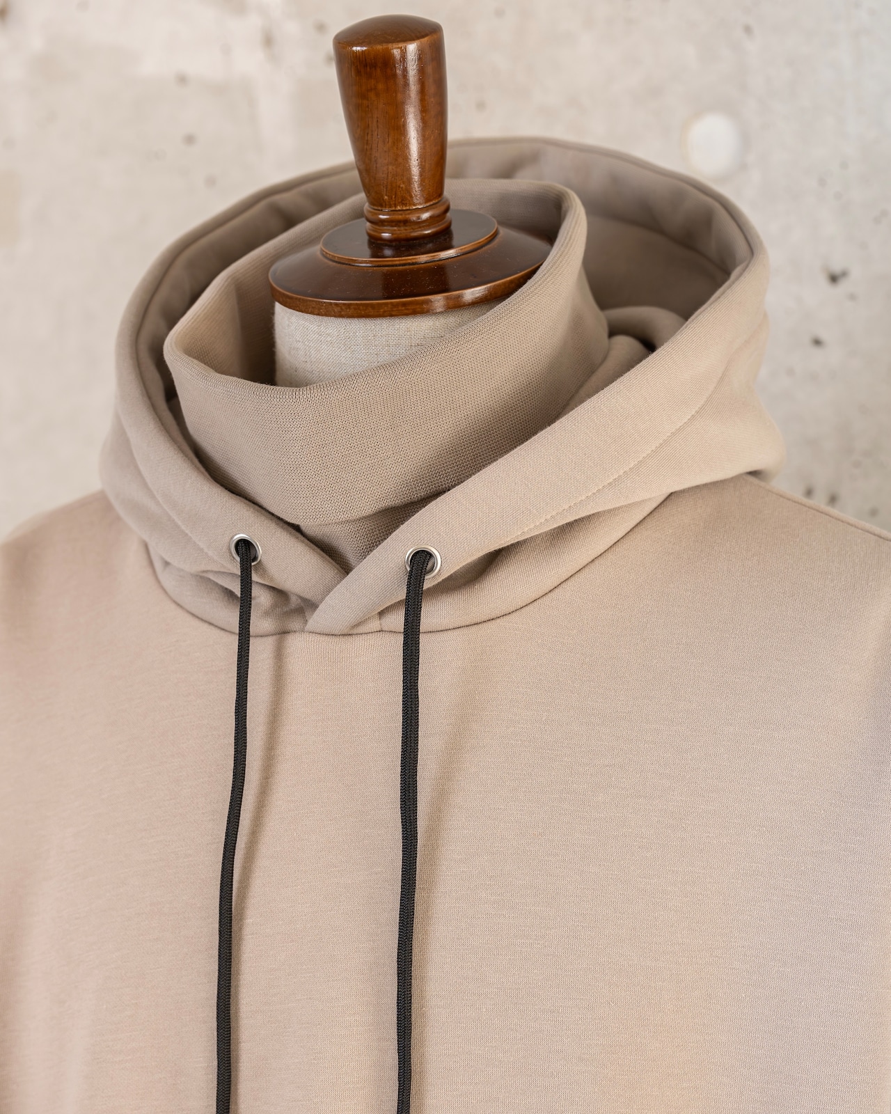 ハイネックとフードをミックスしたデザインが特徴のスウェットプルオーバー