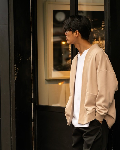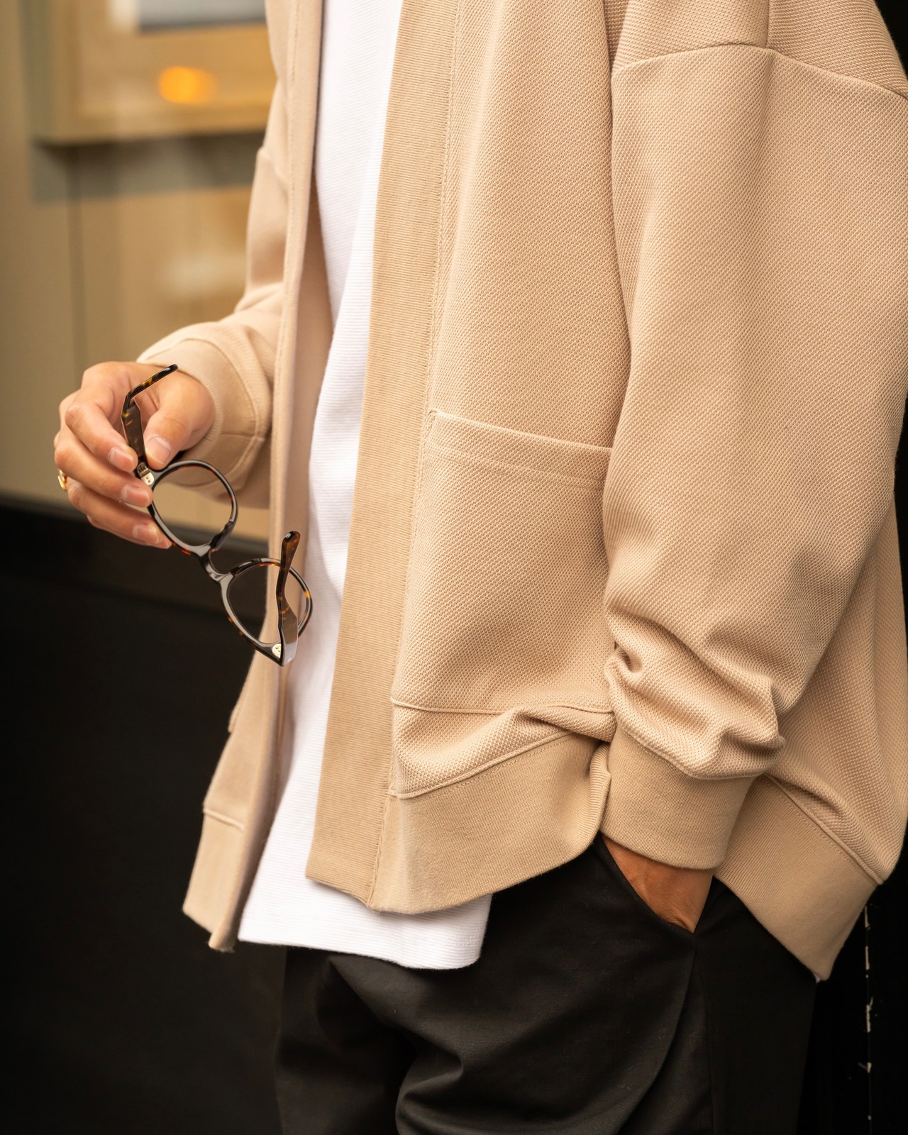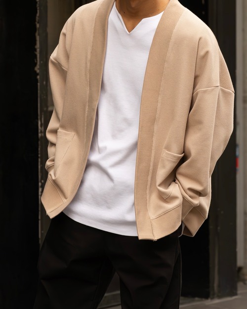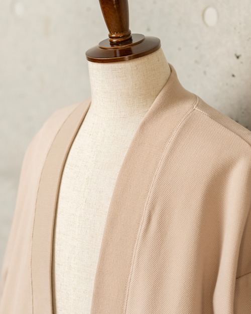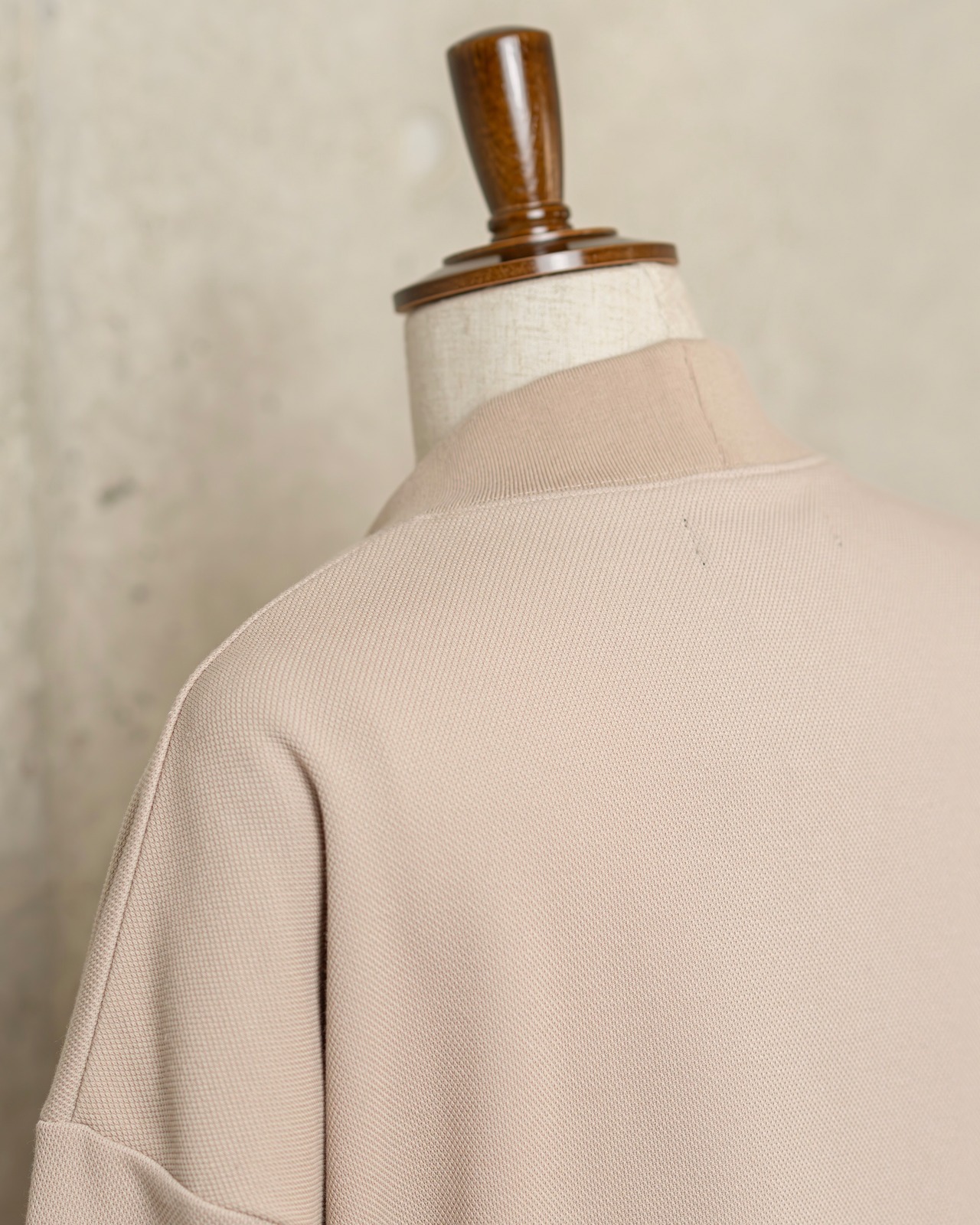 ボタンの無い「ボタンレスデザイン」がモダンな印象でデザイン性はシンプルに、素材感も鹿の子特有のさりげない凹凸表情。