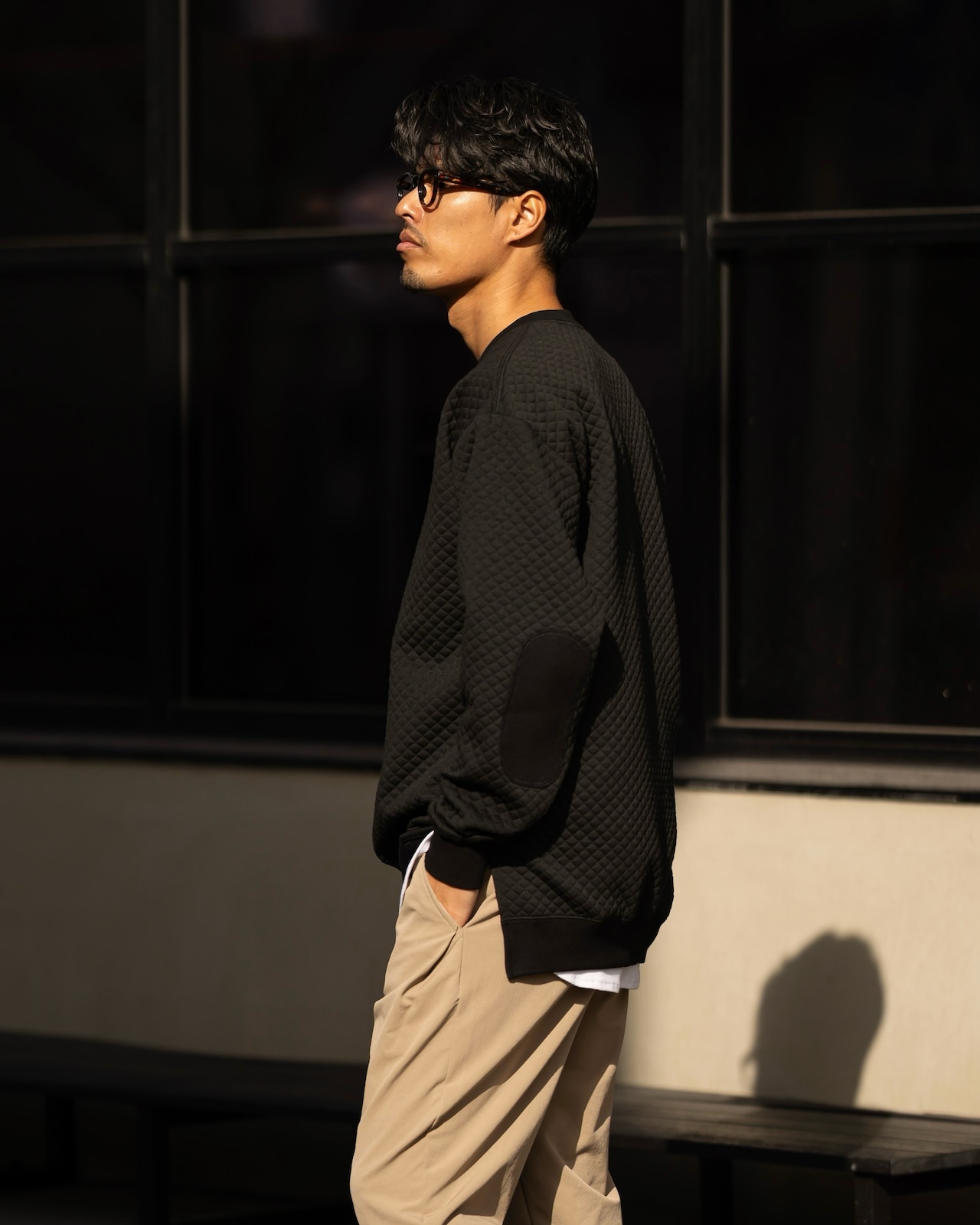 キルティング加工は生地と生地の間に中綿を挟み、刺し縫いをして膨らみを持たせ模様を出す加工で膨らみのある生地表情が特徴的です。