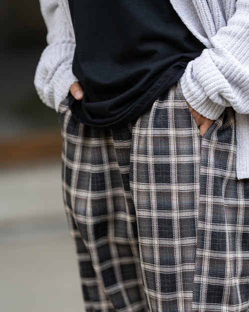 チェックパターンのポンチカットソーを使用したリラックスパンツ