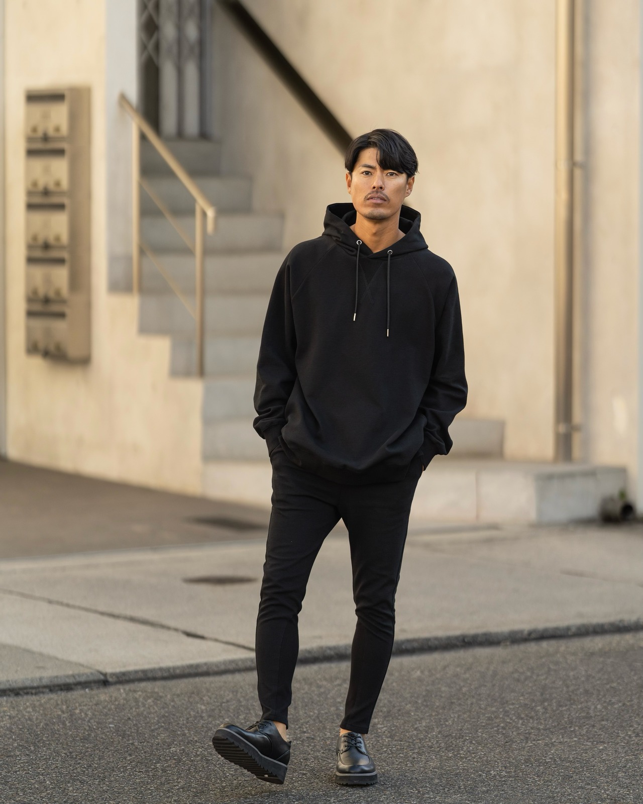 通常スウェットアイテムが多いフーディーデザインですが、表情豊かな生地を用いたアレンジ性がポイントです。